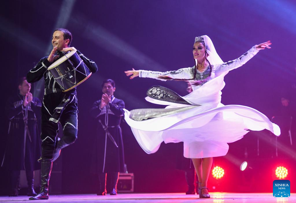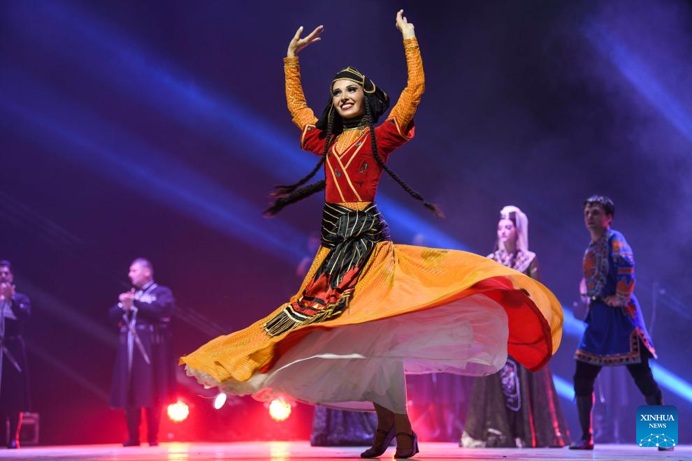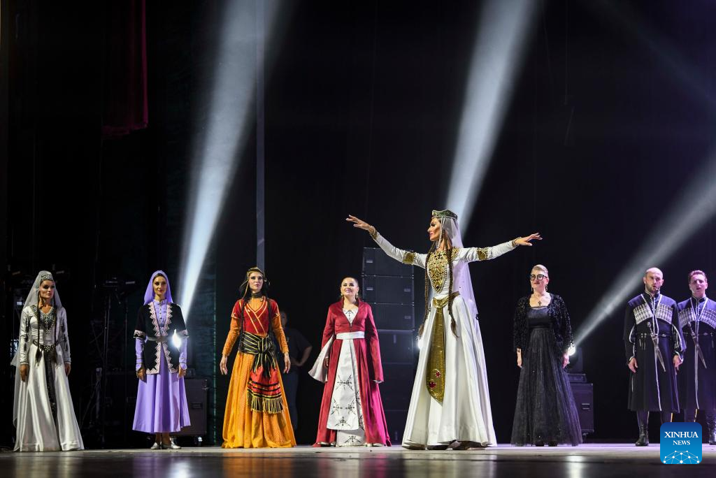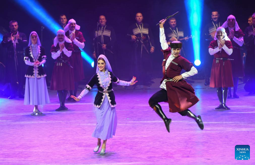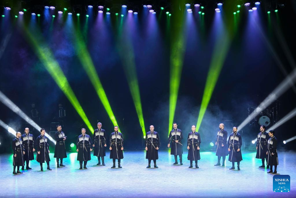 Actors from Georgian State National Singing and Dancing Academic Ensemble Erisioni perform during the 6th China Xinjiang International Dance Festival in Urumqi, northwest China's Xinjiang Uygur Autonomous Region, Aug. 3, 2023. (Xinhua/Hu Huhu)