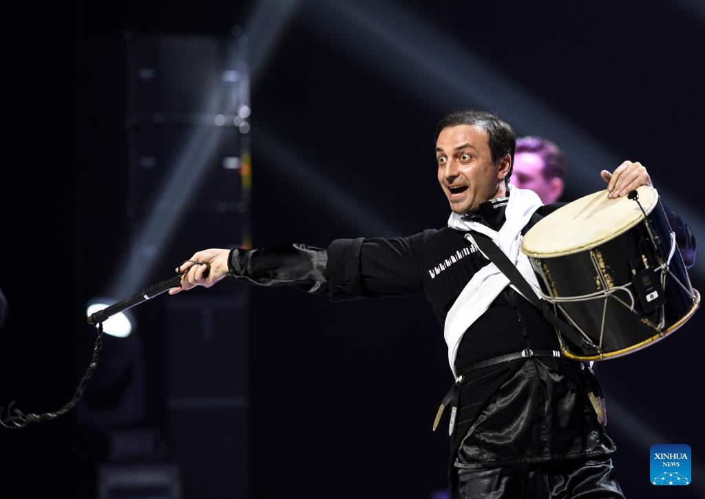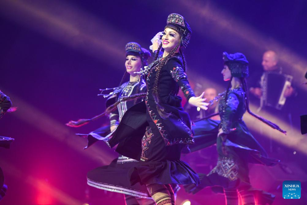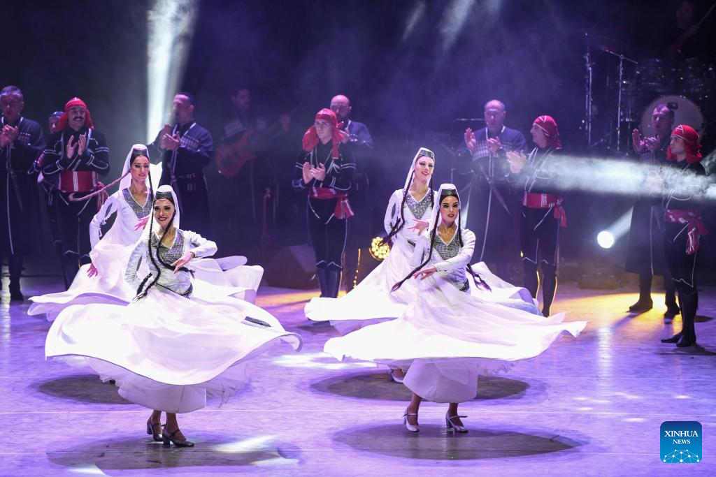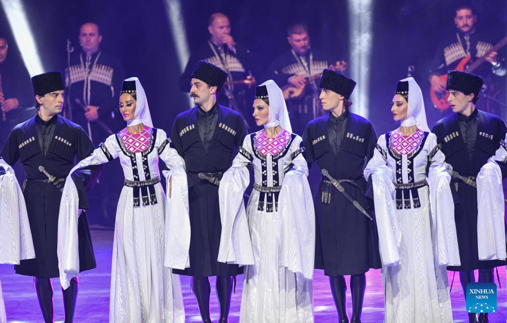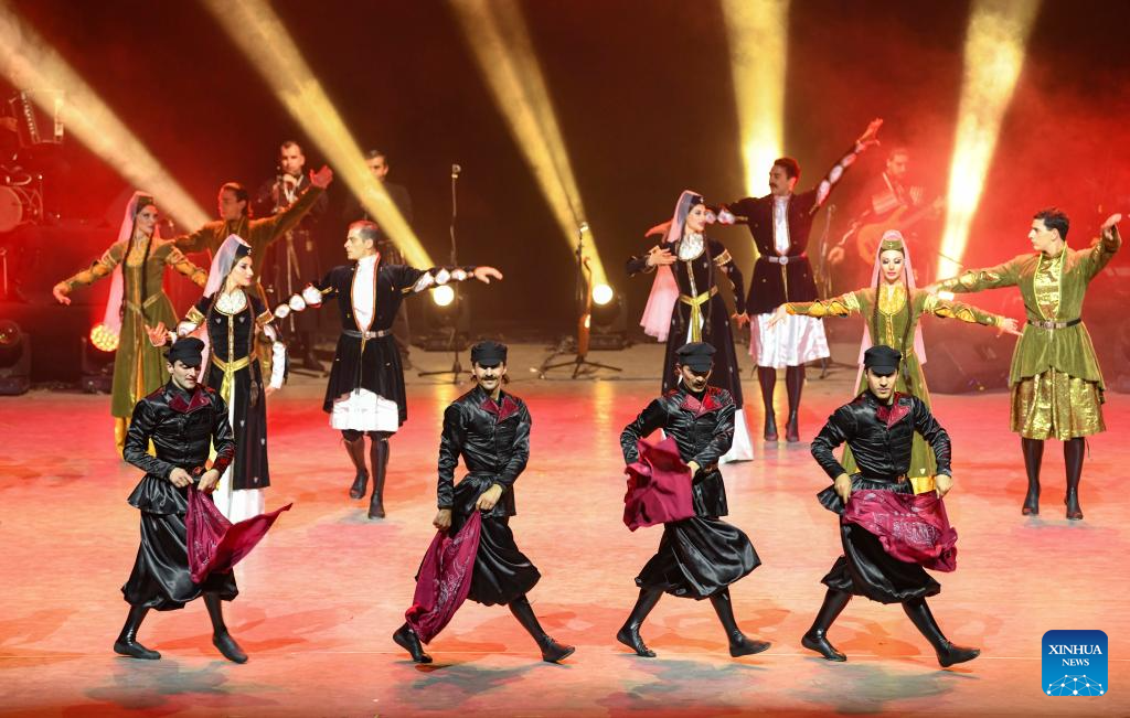 Actors from Georgian State National Singing and Dancing Academic Ensemble Erisioni perform during the 6th China Xinjiang International Dance Festival in Urumqi, northwest China's Xinjiang Uygur Autonomous Region, Aug. 3, 2023. (Xinhua/Hu Huhu)