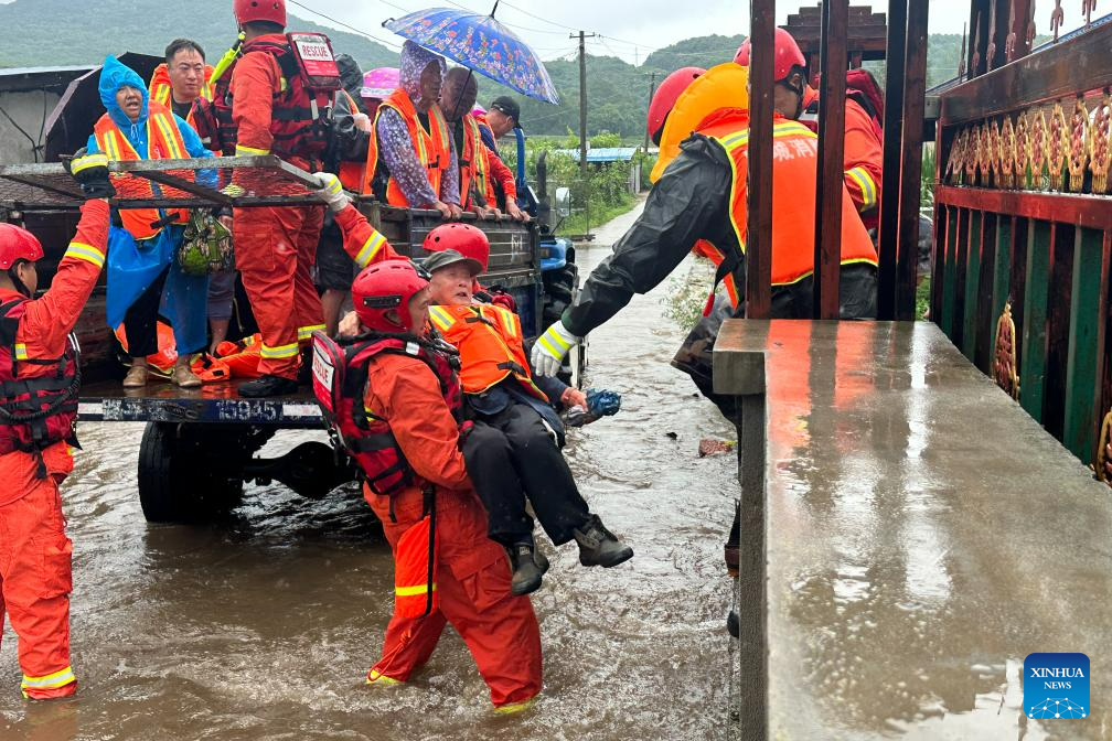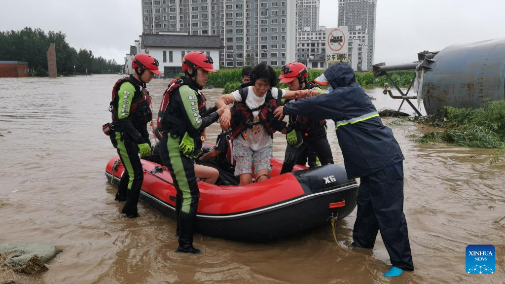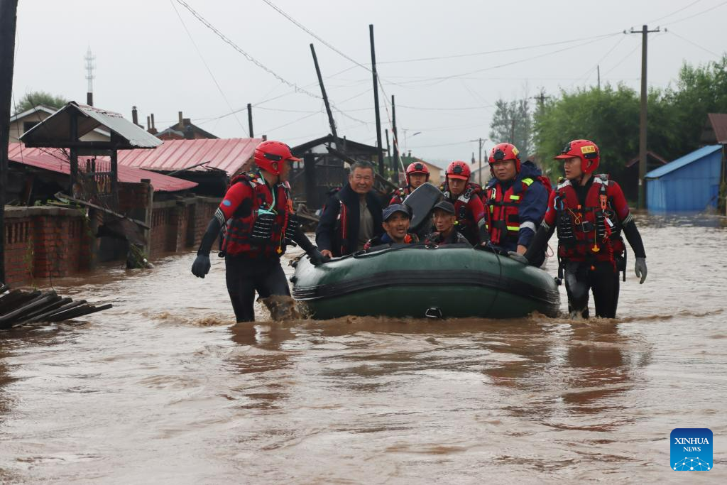 Firefighters rescue stranded villagers in the flood-affected Wanshan Village of Yimianpo Town in Shangzhi City, Harbin, northeast China's Heilongjiang Province, Aug. 4, 2023. As heavy rainfall hit Shangzhi City and rising water levels of the Mayi River caused waterlogging in parts of the city, members of the Harbin forest fire brigade are charged with rescue tasks such as embankment in flood-affected areas and evacuation of stranded residents. (Xinhua)