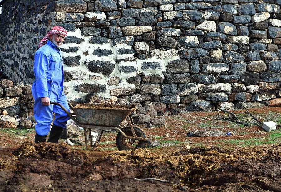 Al-Muthana Hasan al-Shoufi, 53, collects cow dung to use later as heating fuel during the harsh winter in Syria on Jan. 23, 2022. (Photo by Ammar Safarjalani/Xinhua)