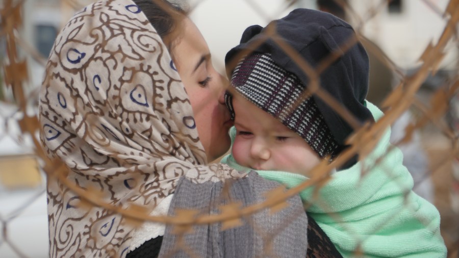 An Afghan woman holds her child as she leaves the country at Islam Qala, a town along the border with Iran in the western Herat province of Afghanistan, March 3, 2022. (Photo by Mashal/Xinhua)