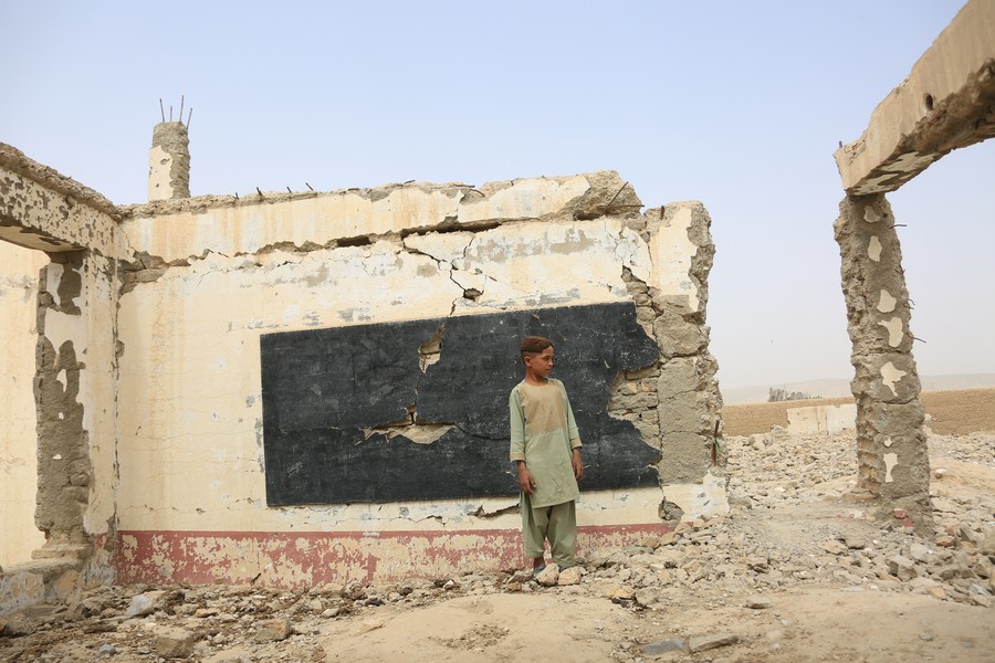 A boy stands in the ruins caused by U.S. air strikes in Sangin district of Helmand Province, Afghanistan, Aug. 23, 2022. (Photo by Saifurahman Safi/Xinhua)