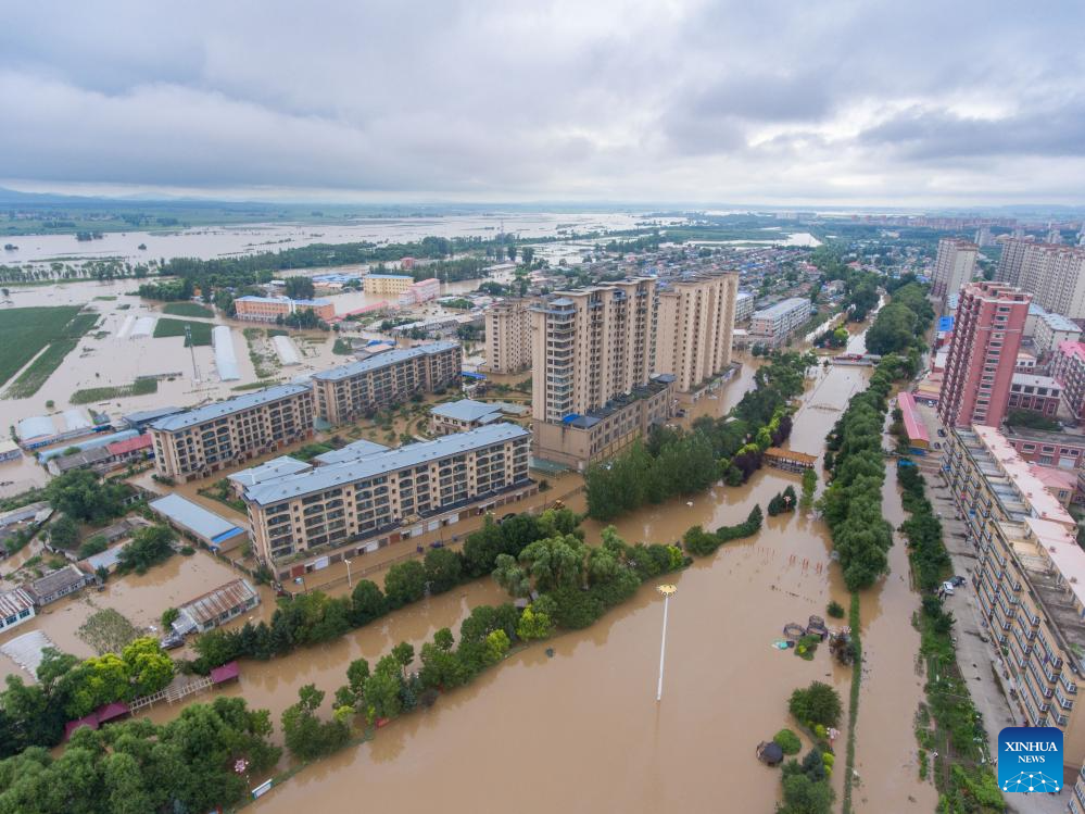 This aerial photo taken on Aug. 5, 2023 shows flooded areas in Yanshou County of Harbin, northeast China's Heilongjiang Province. Triggered by torrential rains in the city of Mudanjiang and the provincial capital Harbin, water levels of some rivers here have surpassed the warning water level. Emergency rescue teams including local firefighters and forest firefighters have been dispatched to help with the rescue and relief work. The 24-hour patrols on the embankments have been conducted to control risks, and the floods affected residents have been relocated. (Photo by Gu Jingkun/Xinhua)