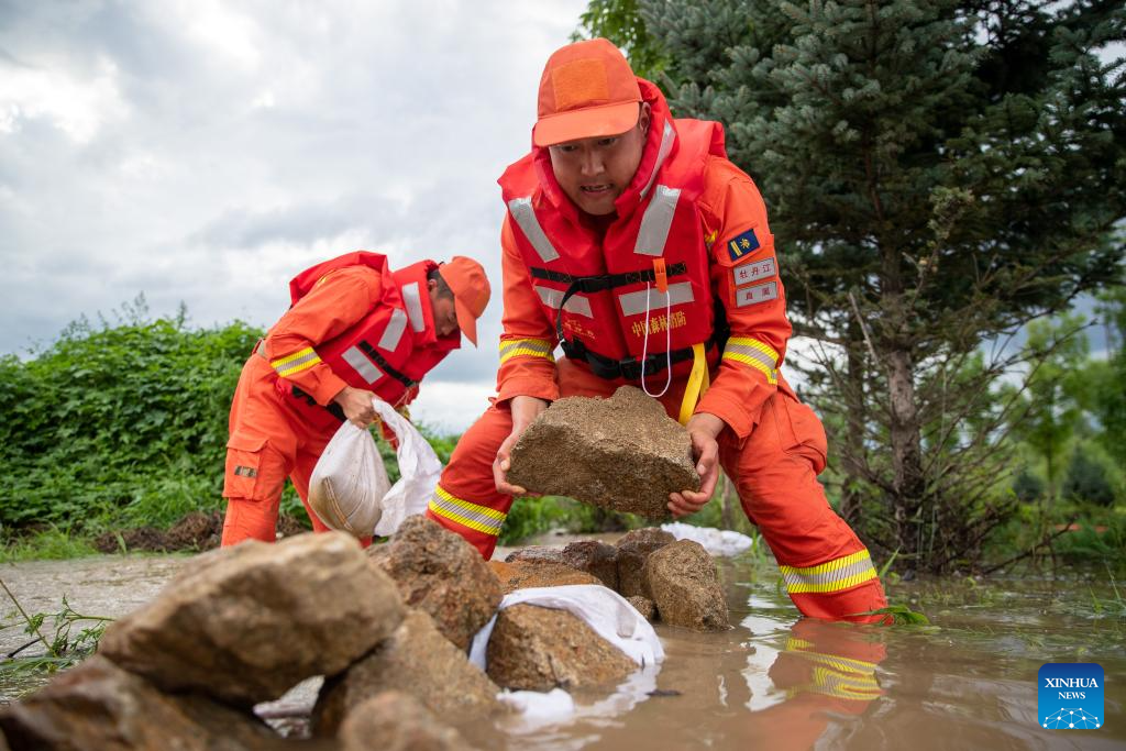Firefighters transfer rocks to block floods near Dawan Village of Dong'an District, Mudanjiang, northeast China's Heilongjiang Province, Aug. 5, 2023. Triggered by torrential rains in the city of Mudanjiang and the provincial capital Harbin, water levels of some rivers here have surpassed the warning water level. Emergency rescue teams including local firefighters and forest firefighters have been dispatched to help with the rescue and relief work. The 24-hour patrols on the embankments have been conducted to control risks, and the floods affected residents have been relocated. (Xinhua/Zhang Tao)