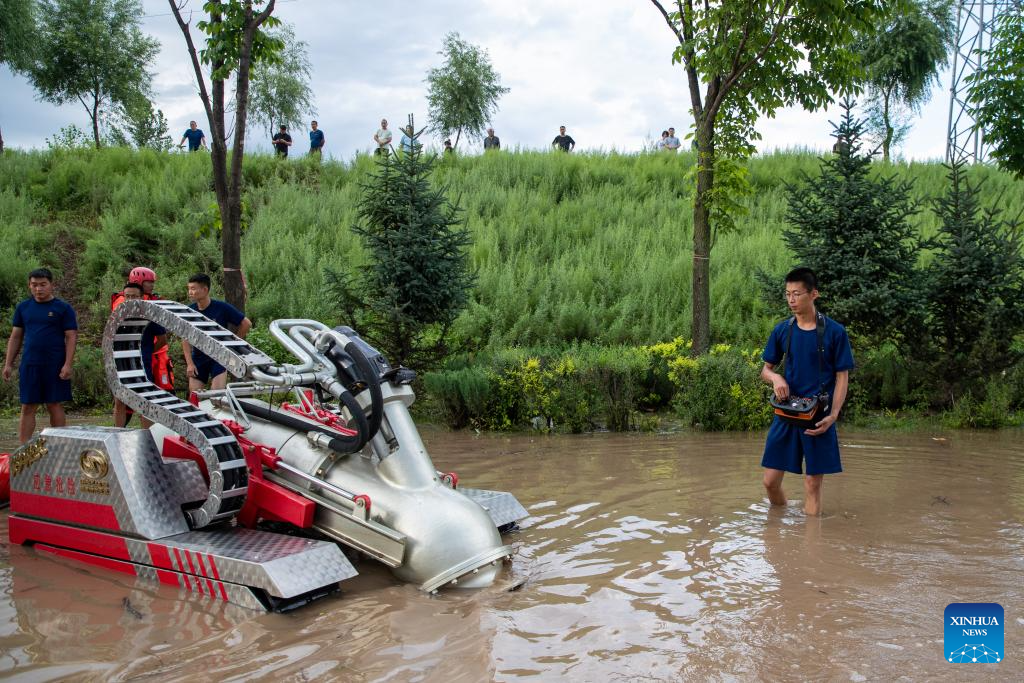 Firefighters operate a drainage machine near Dawan Village of Dong'an District, Mudanjiang, northeast China's Heilongjiang Province, Aug. 5, 2023. Triggered by torrential rains in the city of Mudanjiang and the provincial capital Harbin, water levels of some rivers here have surpassed the warning water level. Emergency rescue teams including local firefighters and forest firefighters have been dispatched to help with the rescue and relief work. The 24-hour patrols on the embankments have been conducted to control risks, and the floods affected residents have been relocated. (Xinhua/Zhang Tao)