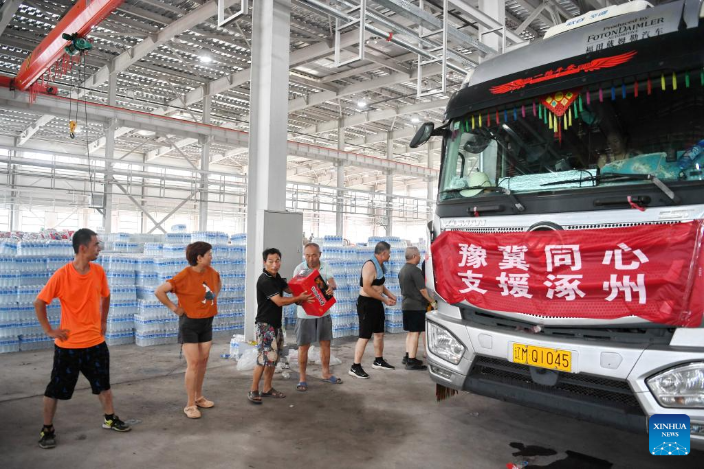 Staff members and volunteers transfer the donated relief supplies at a storage site of relief supplies in Zhuozhou, north China's Hebei Province, Aug. 5, 2023. A large number of donated relief supplies from all over the country arrived in Zhuozhou on Saturday, supporting local people affected by rainstorms and floods. (Xinhua/Mu Yu)