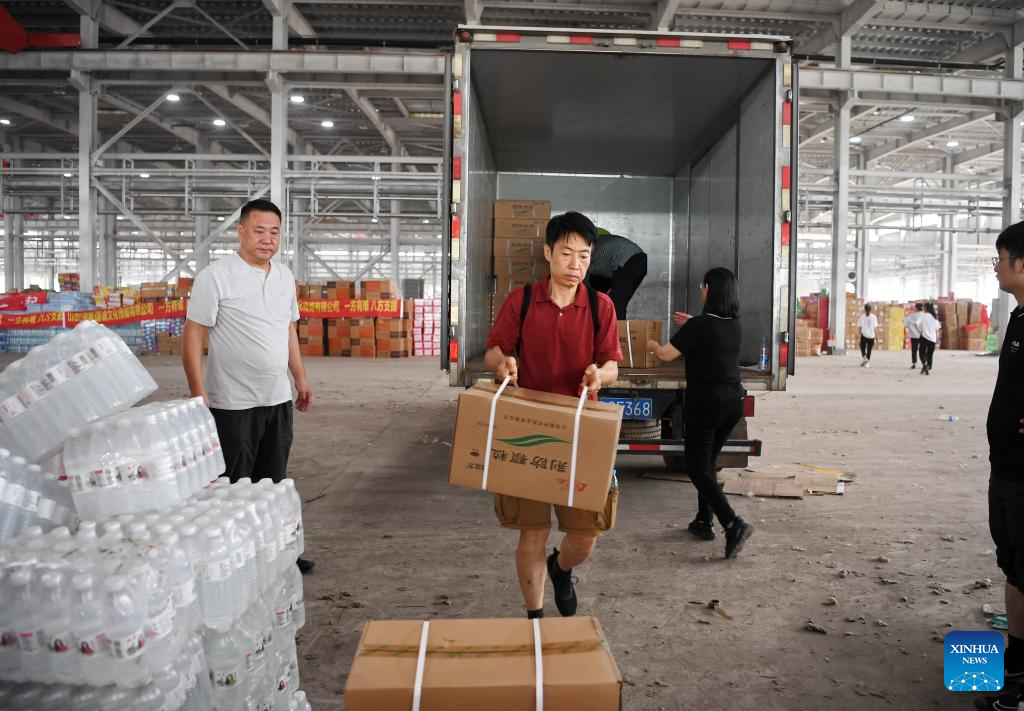 Volunteers from China Charity Federation transfer the donated relief supplies at a storage site of relief supplies in Zhuozhou, north China's Hebei Province, Aug. 5, 2023. A large number of donated relief supplies from all over the country arrived in Zhuozhou on Saturday, supporting local people affected by rainstorms and floods. (Xinhua/Mu Yu)