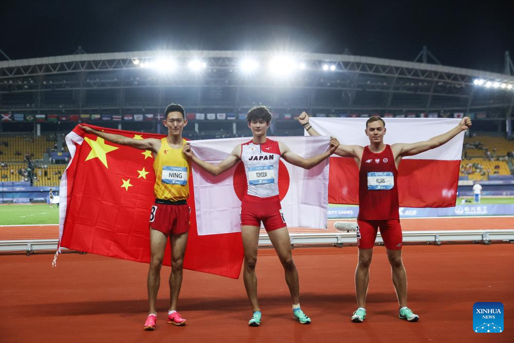 Gold medalist Toyoda Ken (C) of Japan, silver medalist Ning Xiaohan (L) of China and bronze medalist Krzysztof Adam Kiljan of Poland celebrate after the athletics men's 110m hurdles final at the 31st FISU Summer World University Games in Chengdu, southwest China's Sichuan Province, Aug. 5, 2023. (Xinhua/Li Jing)