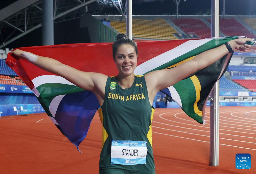 Silver medalist Yolandi Stander of South Africa celebrates after the athletics women's discus throw final at the 31st FISU Summer World University Games in Chengdu, southwest China's Sichuan Province, Aug. 5, 2023. (Xinhua/Jia Haocheng)