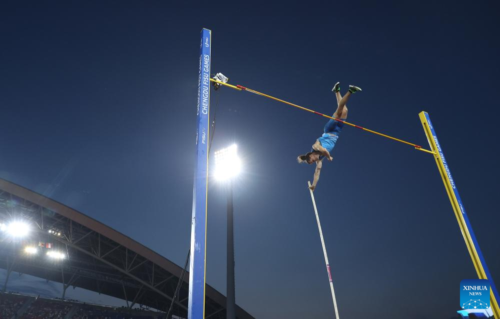 Urho Vaino Johannes Kujanpaa of Finland competes during the athletics men's pole vault final at the 31st FISU Summer World University Games in Chengdu, southwest China's Sichuan Province, Aug. 5, 2023. (Xinhua/Li Jing)