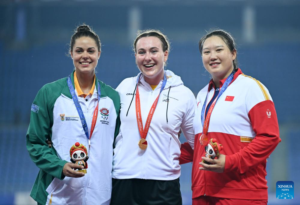 Gold medalist Antonia Maria Leopoldine Kinzel (C) of Germany, silver medalist Yolandi Stander (L) of South Africa and bronze medalist Xie Yuchen of China pose on the podium during the awarding ceremony for the athletics women's discus throw at the 31st FISU Summer World University Games in Chengdu, southwest China's Sichuan Province, Aug. 5, 2023. (Xinhua/Wang Xi)