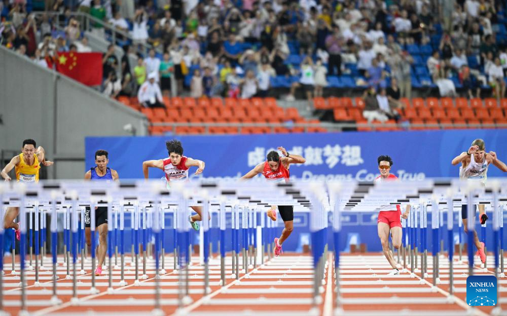 Toyoda Ken (3rd L) of Japan competes during the athletics men's 110m hurdles final at the 31st FISU Summer World University Games in Chengdu, southwest China's Sichuan Province, Aug. 5, 2023. (Xinhua/Deng Hua)