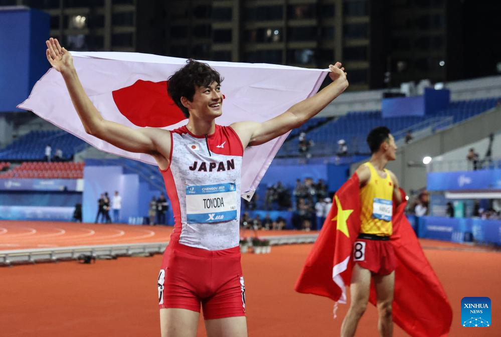 Gold medalist Toyoda Ken of Japan celebrates after the athletics men's 110m hurdles final at the 31st FISU Summer World University Games in Chengdu, southwest China's Sichuan Province, Aug. 5, 2023. (Xinhua/Li Jing)