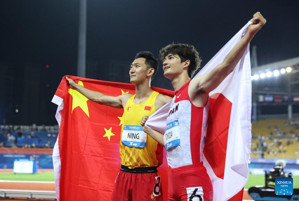 Gold medalist Toyoda Ken (R) of Japan and silver medalist Ning Xiaohan of China celebrate after the athletics men's 110m hurdles final at the 31st FISU Summer World University Games in Chengdu, southwest China's Sichuan Province, Aug. 5, 2023. (Xinhua/Li Jing)
