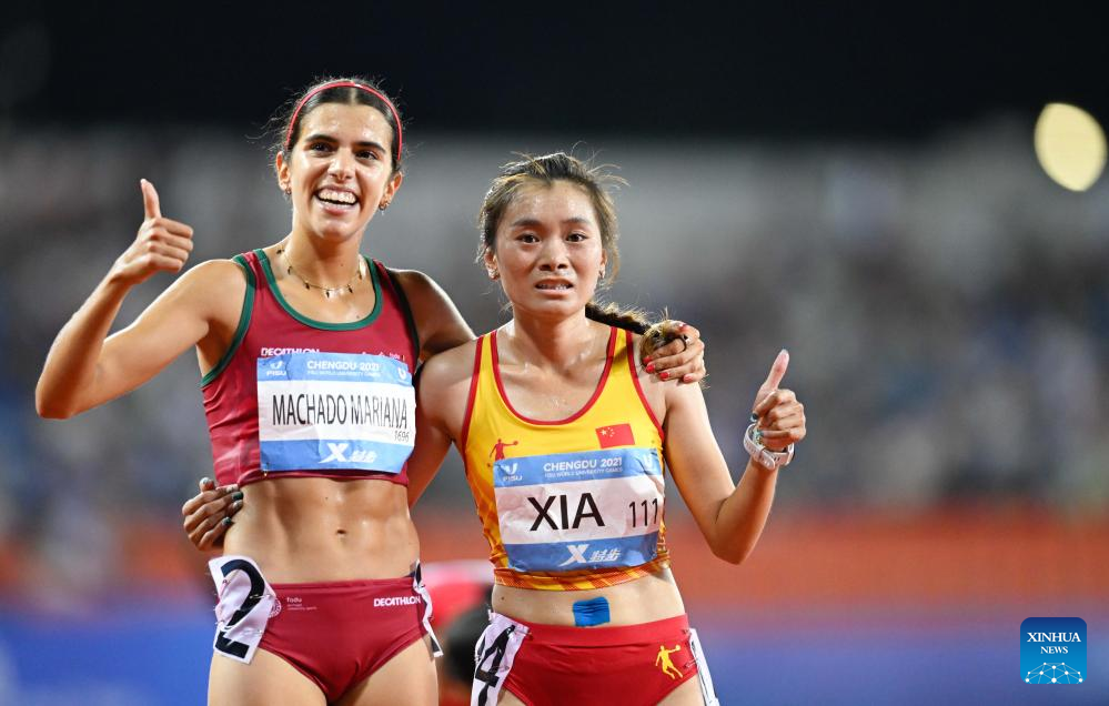 Gold medalist Mariana Machado Carvalho (L) of Portugal celebrates with silver medalist Xia Yuyu of China after the athletics women's 5000m final at the 31st FISU Summer World University Games in Chengdu, southwest China's Sichuan Province, Aug. 5, 2023. (Xinhua/Deng Hua)
