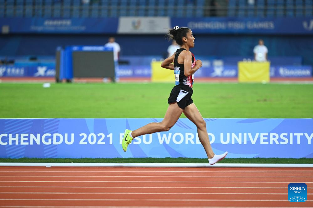 Derya Kunur of Trkiye runs with only one shoe during the athletics women's 5000m final at the 31st FISU Summer World University Games in Chengdu, southwest China's Sichuan Province, Aug. 5, 2023. (Xinhua/Wang Xi)