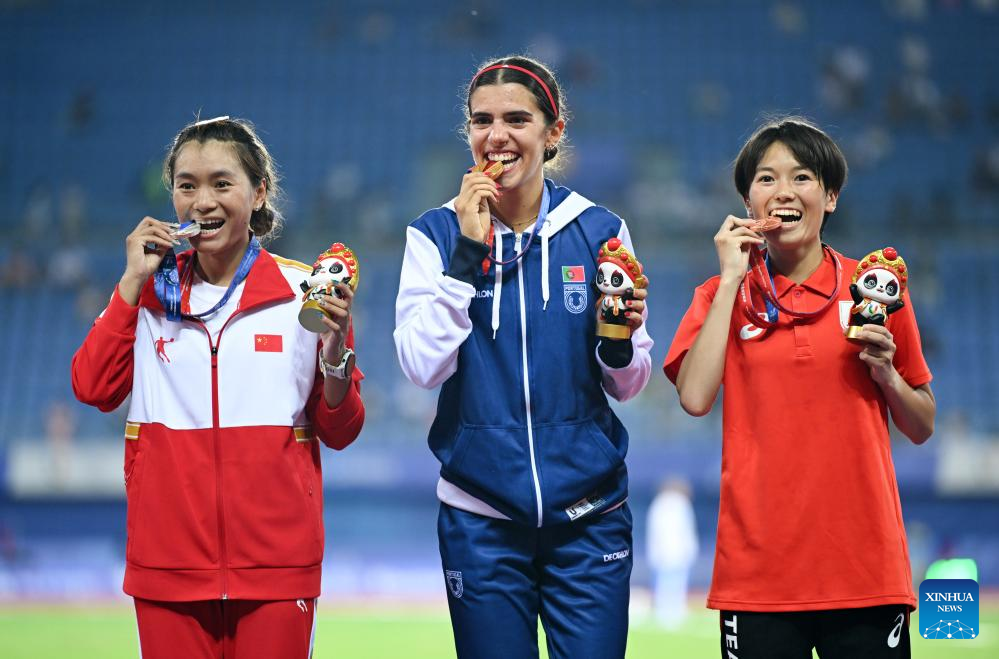 Gold medalist Mariana Machado Carvalho (C) of Portugal, silver medalist Xia Yuyu (L) of China and bronze medalist Yamazaki Risa of Japan attend the awarding ceremony for athletics women's 5000m at the 31st FISU Summer World University Games in Chengdu, southwest China's Sichuan Province, Aug. 5, 2023. (Xinhua/Wang Xi)