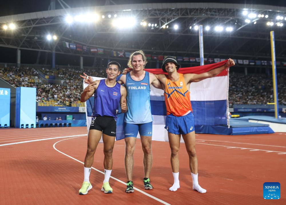 Gold medalist Urho Vaino Johannes Kujanpaa (C) of Finland, silver medalist Patsapong Amsamarng (L) of Thailand and bronze medalist Koen Evan Van Der Wijst of the Netherlands celebrate after the athletics men's pole vault final at the 31st FISU Summer World University Games in Chengdu, southwest China's Sichuan Province, Aug. 5, 2023. (Xinhua/Li Jing)