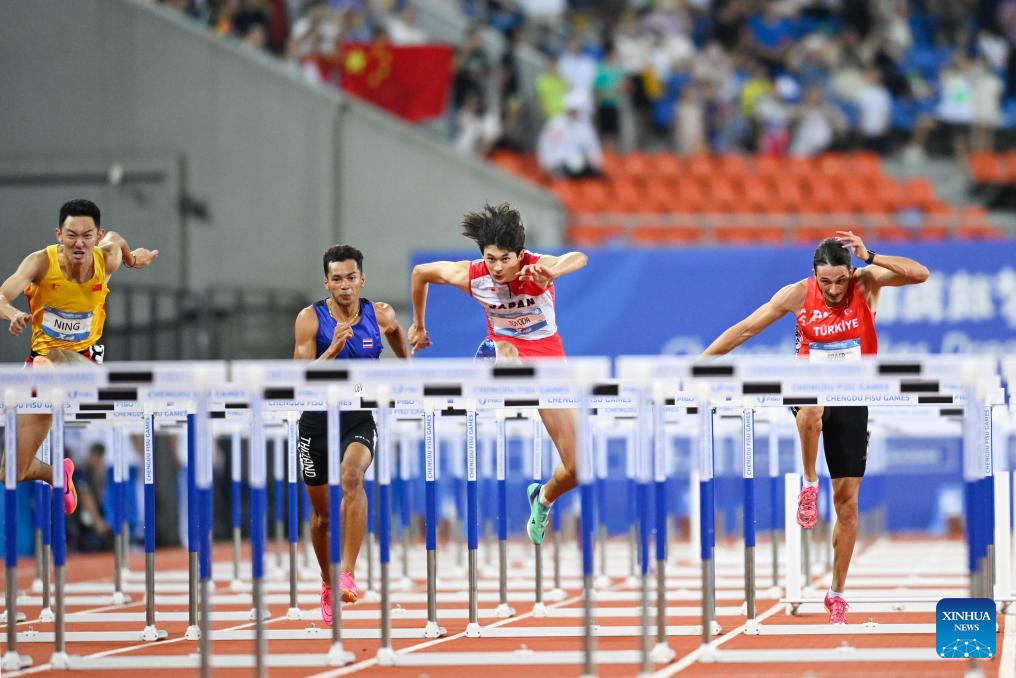 Toyoda Ken (2nd R) of Japan competes during the athletics men's 110m hurdles final at the 31st FISU Summer World University Games in Chengdu, southwest China's Sichuan Province, Aug. 5, 2023. (Xinhua/Deng Hua)