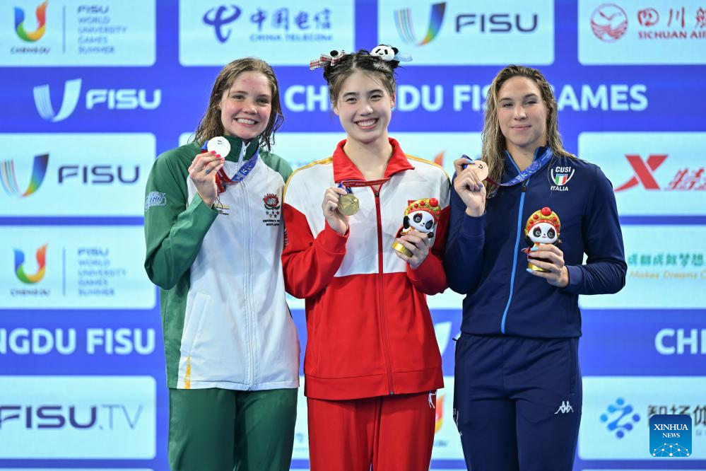 Gold medalist Zhang Yufei (C) of China, silver medalist Erin Paige Gallagher (L) of South Africa and bronze medalist Giulia D'innocenzo of Italy attend the awarding ceremony for swimming women's 100m butterfly at the 31st FISU Summer World University Games in Chengdu, southwest China's Sichuan Province, Aug. 5, 2023. (Xinhua/Chen Zeguo)