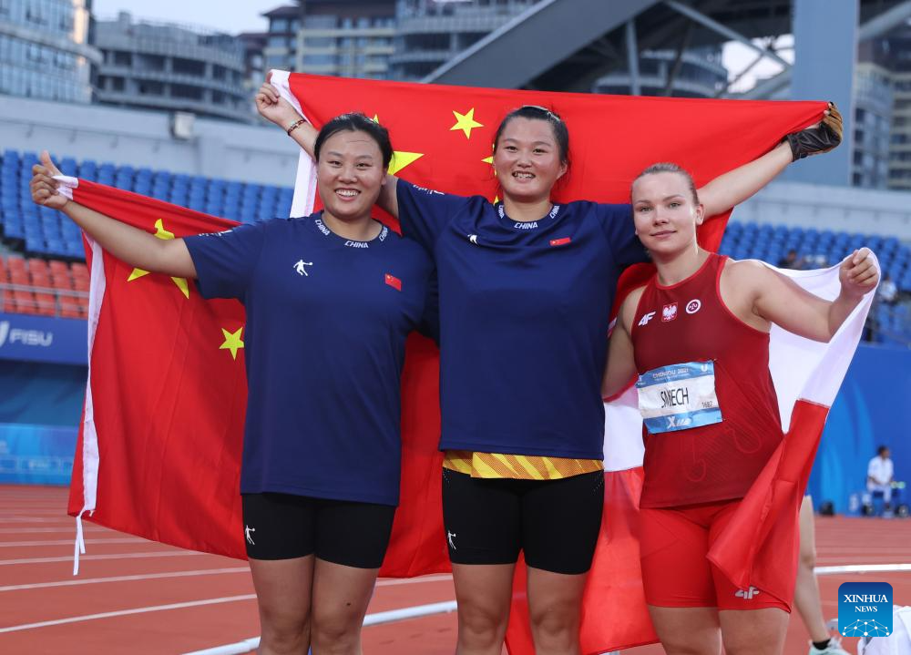 Gold medalist Li Jiangyan (C) of China, silver medalist Xu Xinying (L) of China and bronze medalist Aleksandra Smiech of Poland celebrate after the athletics women's hammer throw final at the 31st FISU Summer World University Games in Chengdu, southwest China's Sichuan Province, Aug. 5, 2023. (Xinhua/Jia Haocheng)