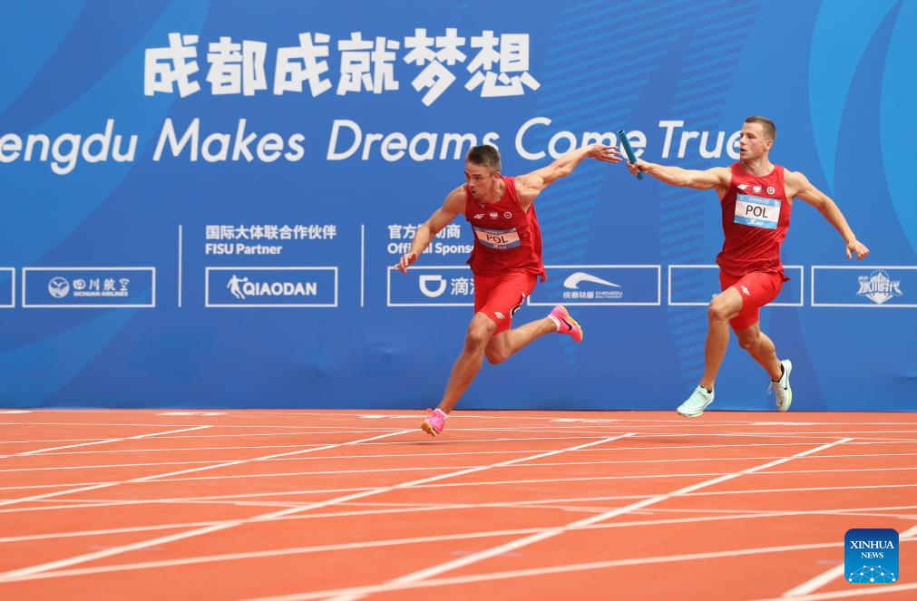 Patryk Tomasz Wykrota (R) and Mateusz Siuda of Poland compete during the Athletics Men's 4x100m Round 1 Heats at the 31st FISU Summer World University Games in Chengdu, southwest China's Sichuan Province, Aug. 5, 2023. (Xinhua/Li Jing)