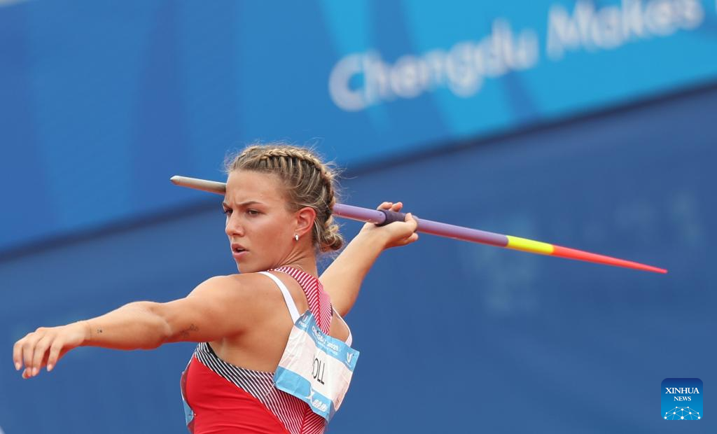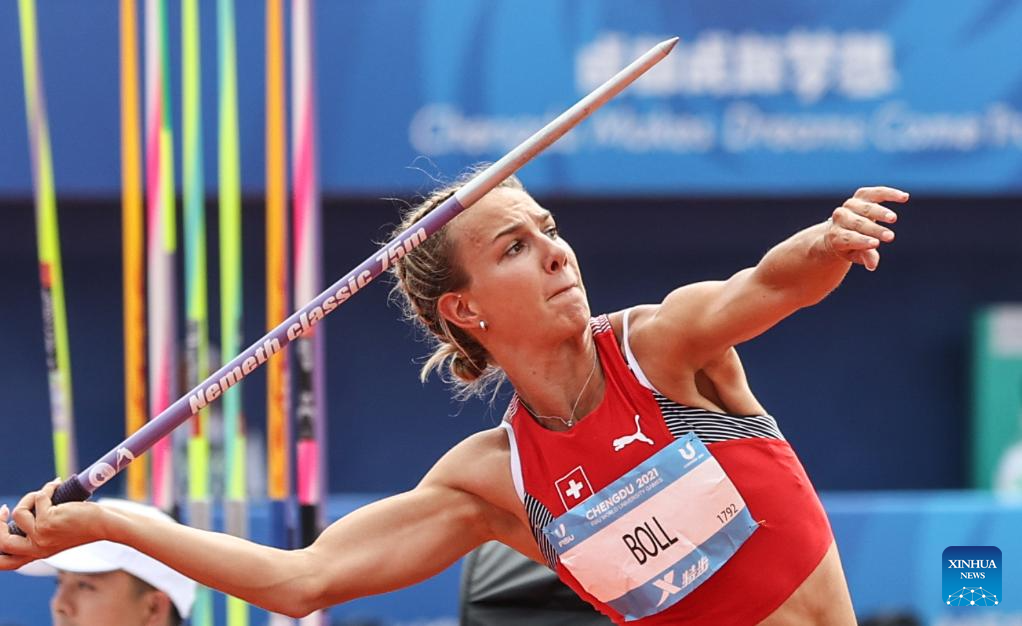 Lydia Madelaine Boll of Switzerland competes during the Javalin Throw of the Athletics Women's Heptathlon at the 31st FISU Summer World University Games in Chengdu, southwest China's Sichuan Province, Aug. 5, 2023. (Xinhua/Li Jing)
