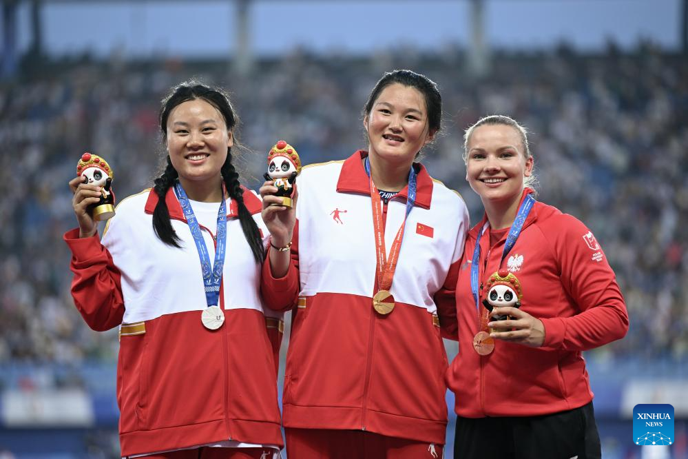 Gold medalist Li Jiangyan (C) of China, silver medalist Xu Xinying (L) of China and bronze medalist Aleksandra Smiech of Poland attend the awarding ceremony for the athletics women's hammer throw at the 31st FISU Summer World University Games in Chengdu, southwest China's Sichuan Province, Aug. 5, 2023. (Xinhua/Wang Xi)