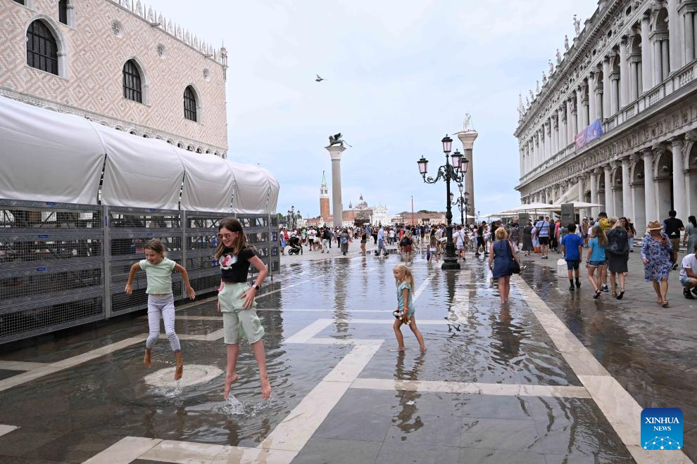 Children play in a waterlogged area in Venice, Italy, Aug. 4, 2023. The water level in Venice has risen recently, and some areas in the city are waterlogged. (Photo by Alberto Lingria/Xinhua)
