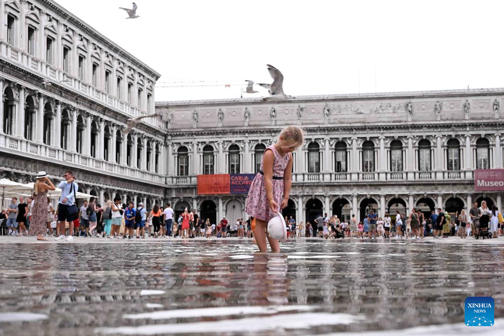 A girl stands at the waterlogged St. Mark's Square in Venice, Italy, Aug. 4, 2023. The water level in Venice has risen recently, and some areas in the city are waterlogged. (Photo by Alberto Lingria/Xinhua)