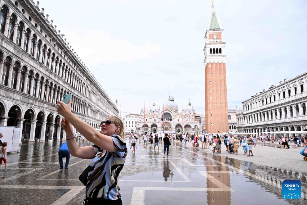 A tourist takes a selfie at the waterlogged St. Mark's Square in Venice, Italy, Aug. 4, 2023. The water level in Venice has risen recently, and some areas in the city are waterlogged. (Photo by Alberto Lingria/Xinhua)