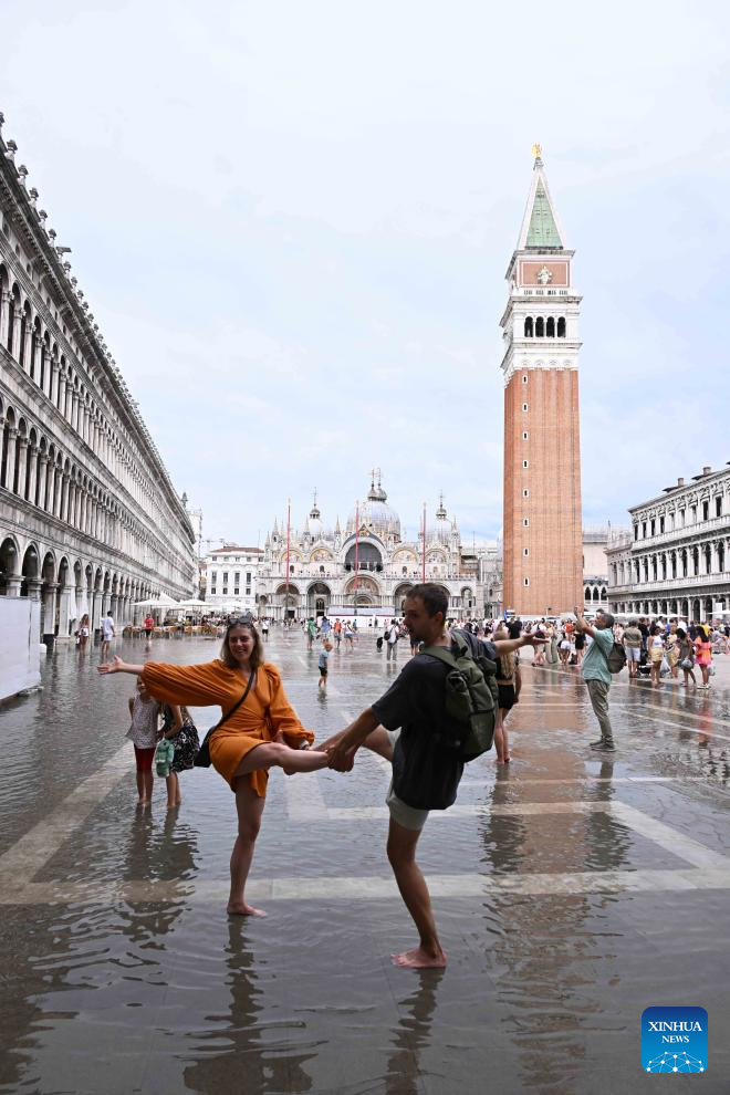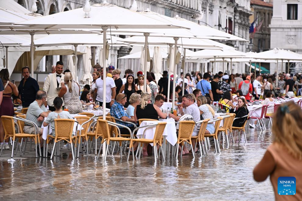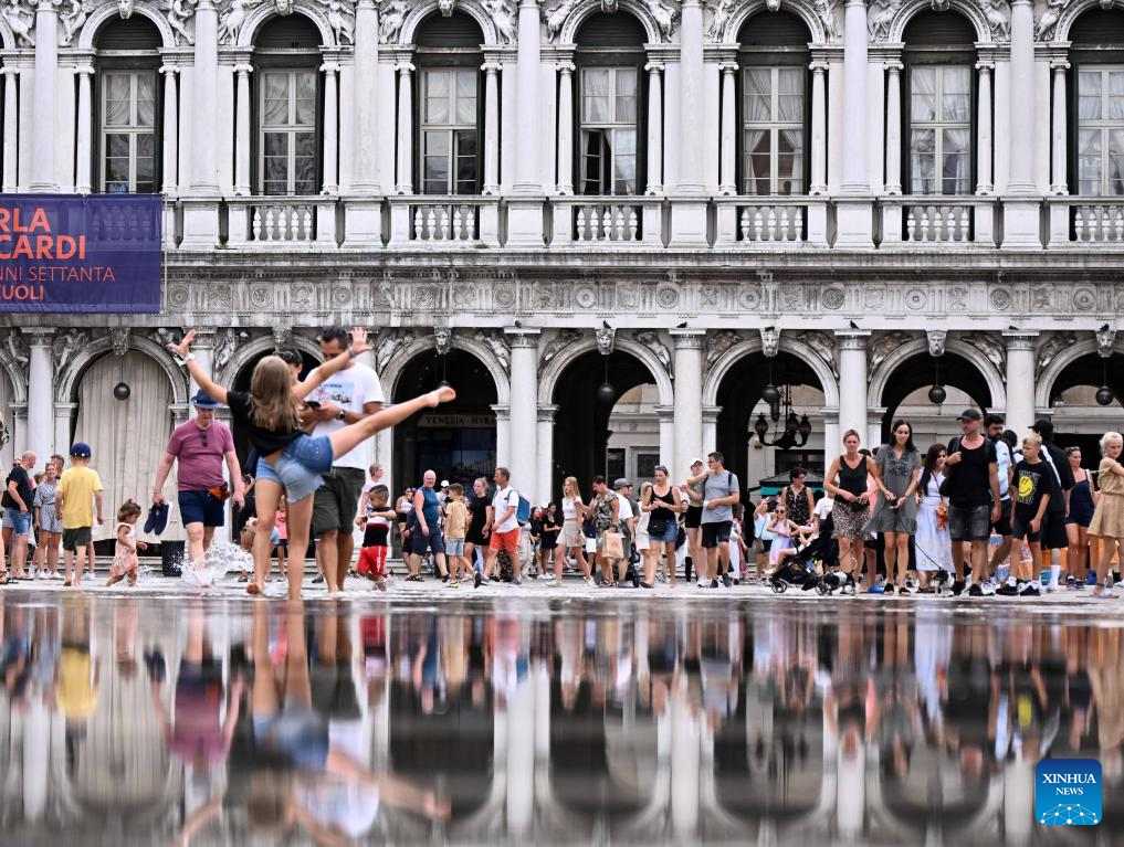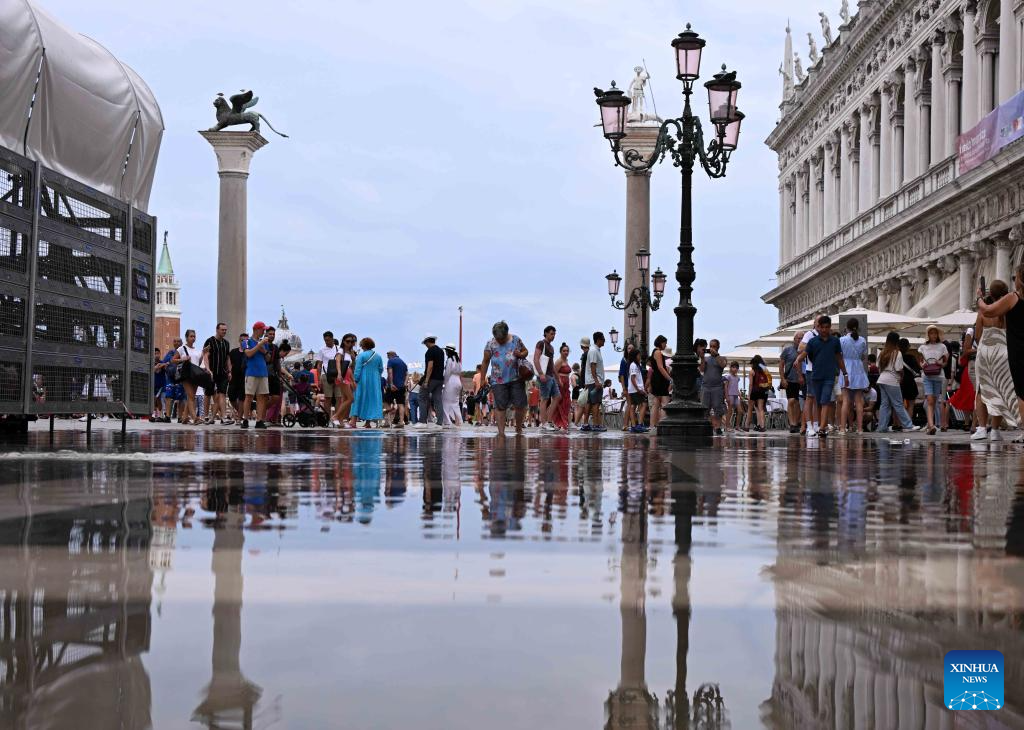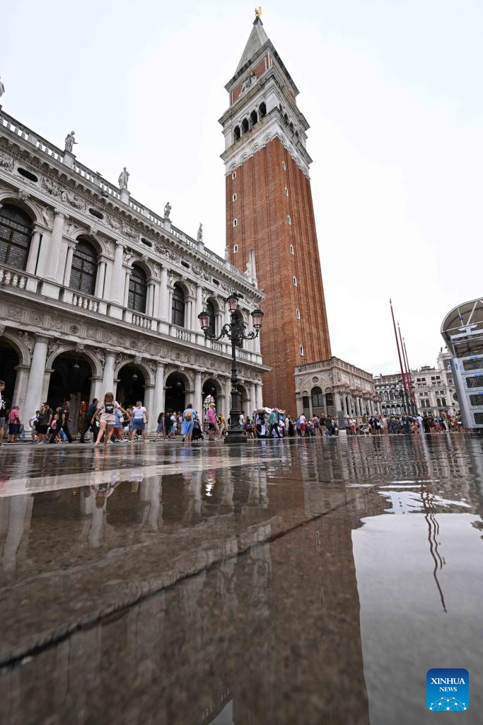 This photo taken on Aug. 4, 2023 shows a waterlogged area in Venice, Italy. The water level in Venice has risen recently, and some areas in the city are waterlogged. (Photo by Alberto Lingria/Xinhua)