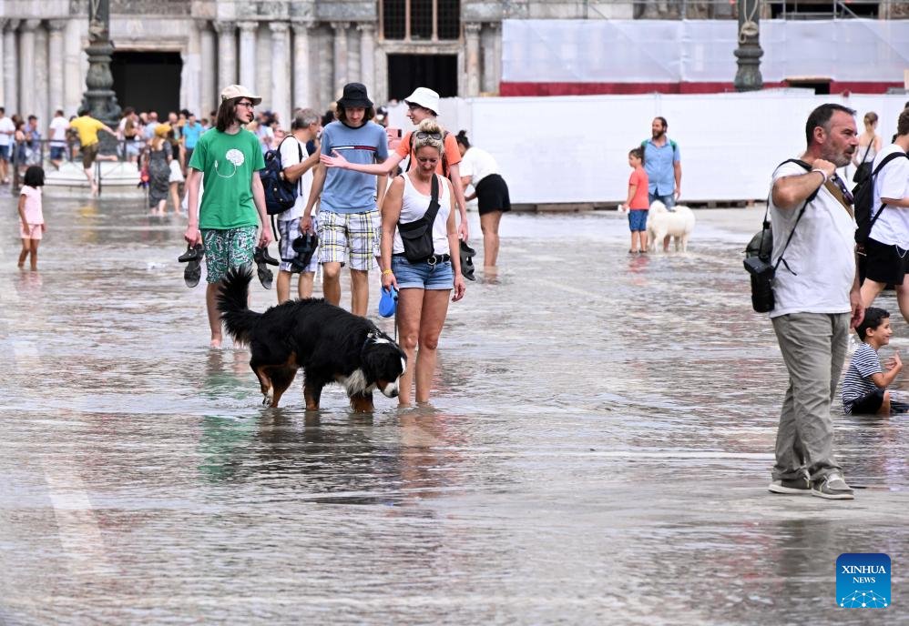 Tourists gather at the waterlogged St. Mark's Square in Venice, Italy, Aug. 4, 2023. The water level in Venice has risen recently, and some areas in the city are waterlogged. (Photo by Alberto Lingria/Xinhua)