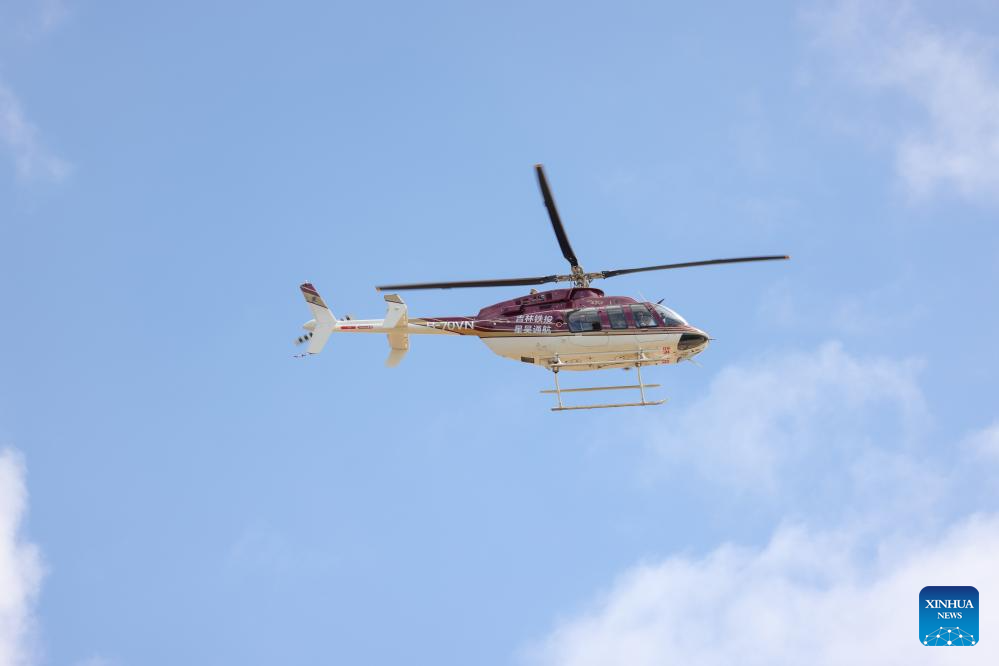 Rescuers use a helicopter to carry out rescue and relief operations in Qili Township, Shulan City, northeast China's Jilin Province, Aug. 5, 2023.