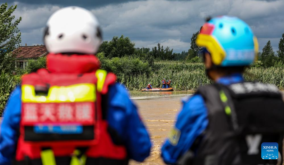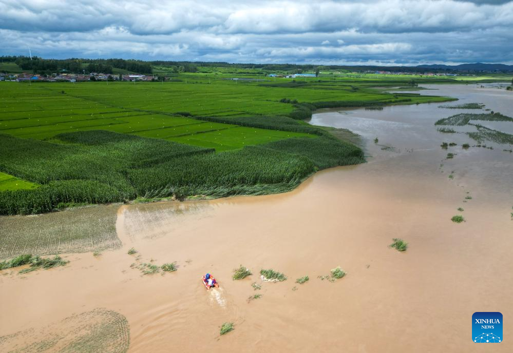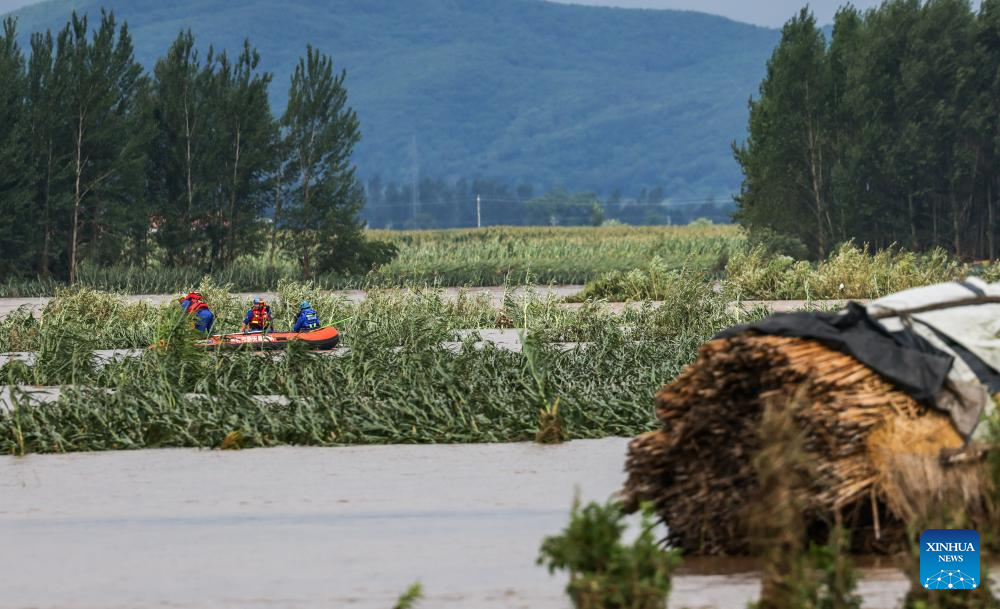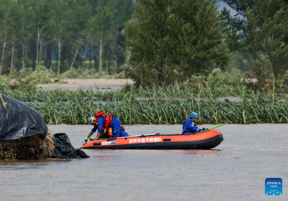Emergency rescuers carry out rescue and relief operations in a flood-affected area in Kaiyuan Town, Shulan City, northeast China's Jilin Province, Aug. 5, 2023.