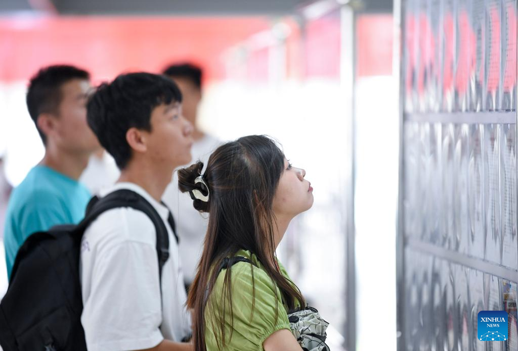 Job seekers read recruitment information at a job fair in Yinchuan, capital city of northwest China's Ningxia Hui Autonomous Region, Aug. 5, 2023. A job fair was held for young talents and college graduates on Saturday in Yinchuan. The job fair attracted more than 50 employers, providing over 1,000 job positions. (Xinhua/Feng Kaihua)