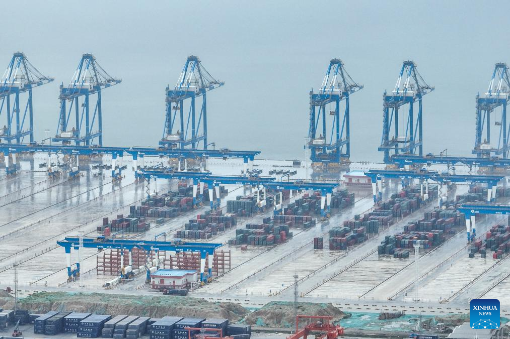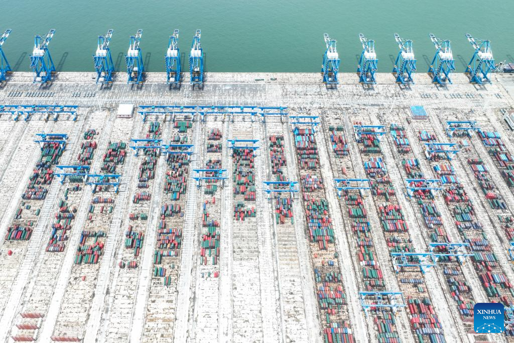 This aerial photo taken on July 22, 2023 shows an automated container wharf of the Beibu Gulf Port in Qinzhou, south China's Guangxi Zhuang Autonomous Region. Qinzhou is a node of the New International Land-Sea Trade Corridor connecting Guangxi and ASEAN countries, and its location is highly beneficial, granting the city an important role in international land-sea transport connectivity. (Xinhua/Cao Yiming)