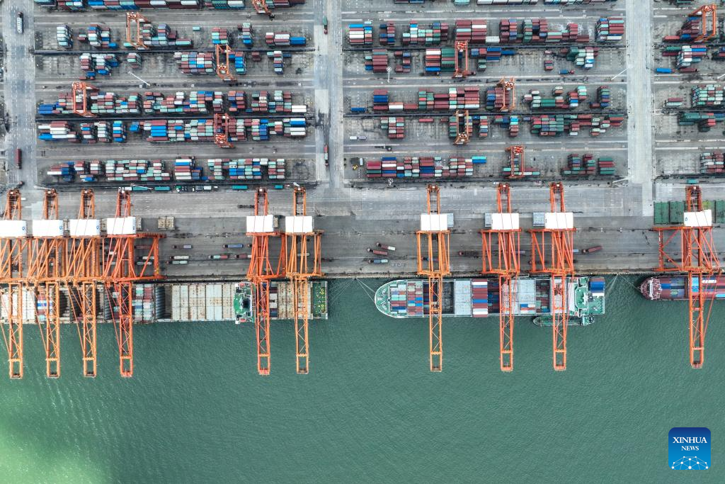 This aerial photo taken on July 22, 2023 shows a container wharf of the Beibu Gulf Port in Qinzhou, south China's Guangxi Zhuang Autonomous Region. Qinzhou is a node of the New International Land-Sea Trade Corridor connecting Guangxi and ASEAN countries, and its location is highly beneficial, granting the city an important role in international land-sea transport connectivity. (Xinhua/Cao Yiming)