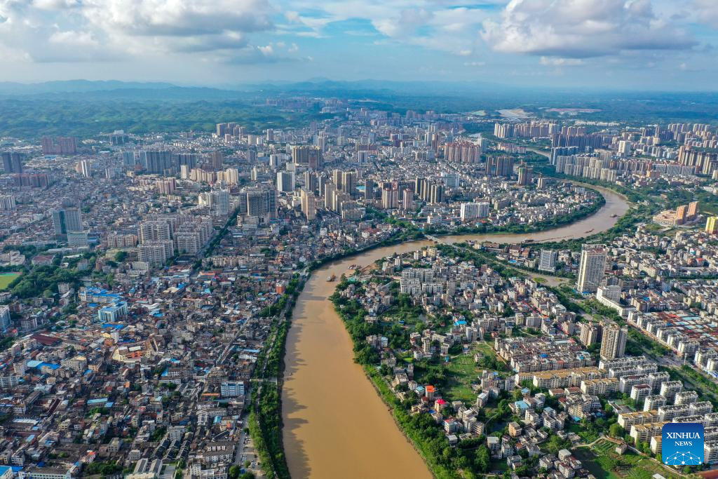 This aerial photo taken on July 22, 2023 shows a view of Qinzhou, south China's Guangxi Zhuang Autonomous Region. Qinzhou is a node of the New International Land-Sea Trade Corridor connecting Guangxi and ASEAN countries, and its location is highly beneficial, granting the city an important role in international land-sea transport connectivity. (Xinhua/Cao Yiming)