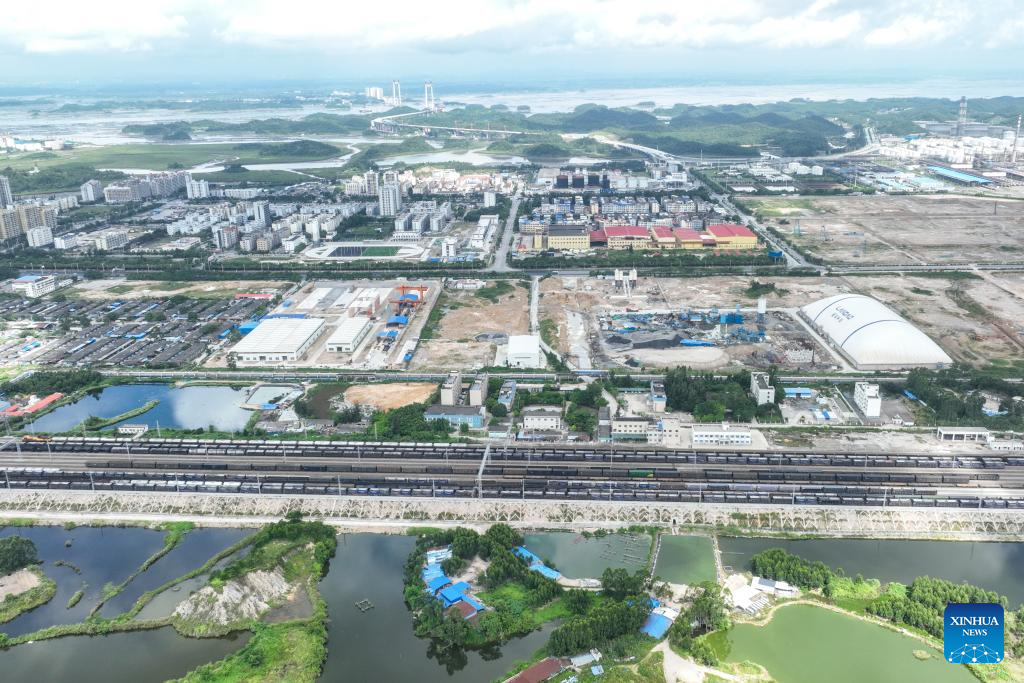 This aerial photo taken on July 22, 2023 shows Qinzhou Port Station and a nearby industrial park in Qinzhou, south China's Guangxi Zhuang Autonomous Region. Qinzhou is a node of the New International Land-Sea Trade Corridor connecting Guangxi and ASEAN countries, and its location is highly beneficial, granting the city an important role in international land-sea transport connectivity. (Xinhua/Cao Yiming)