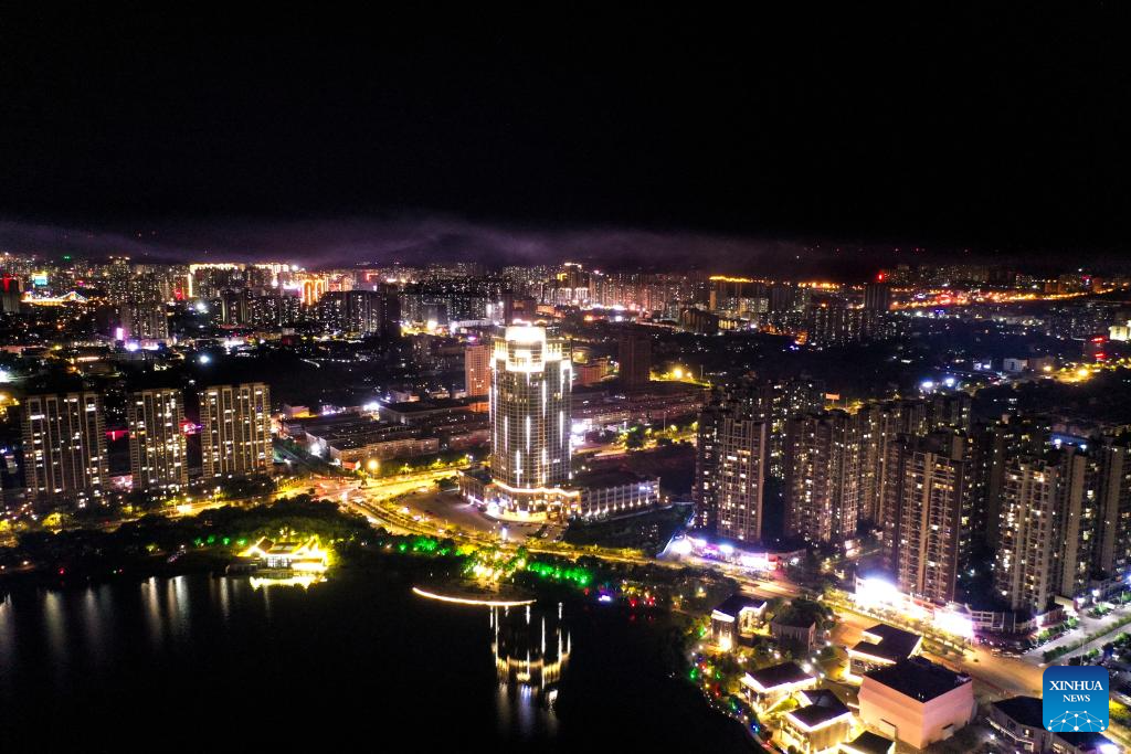 This aerial photo taken on July 21, 2023 shows a night view of Qinzhou, south China's Guangxi Zhuang Autonomous Region. Qinzhou is a node of the New International Land-Sea Trade Corridor connecting Guangxi and ASEAN countries, and its location is highly beneficial, granting the city an important role in international land-sea transport connectivity. (Xinhua/Cao Yiming)