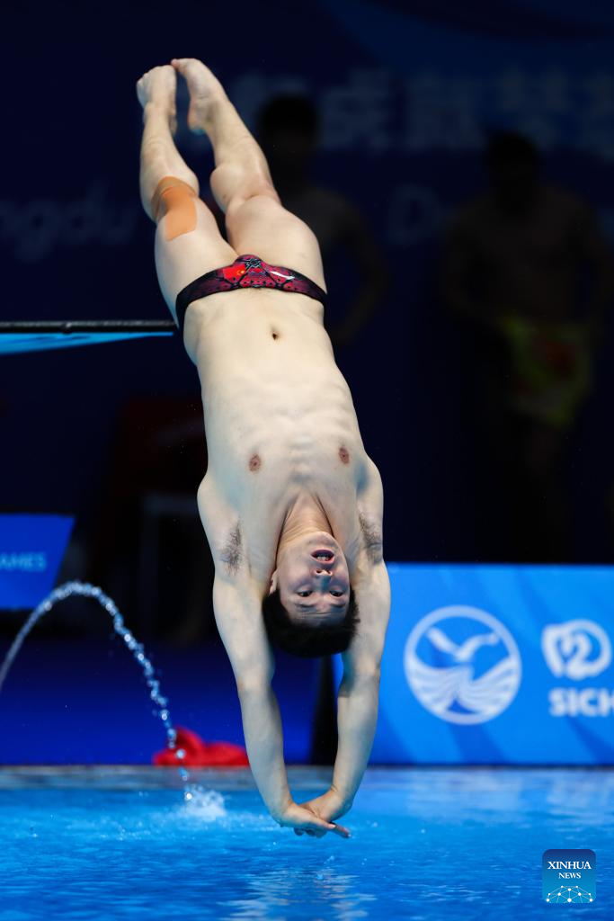 Shi Zhenyu of China competes during the men's 1m springboard final of diving at the 31st FISU Summer World University Games in Chengdu, southwest China's Sichuan Province, Aug. 5, 2023. (Xinhua/Liu Kun)