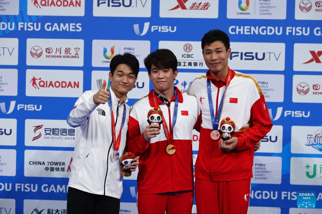 Gold medalist Tai Xiaohu (C) of China, silver medalist Kim Yeongnam (L) of South Korea and bronze medalist Shi Zhenyu of China pose during the awarding ceremony for men's 1m springboard of diving at the 31st FISU Summer World University Games in Chengdu, southwest China's Sichuan Province, Aug. 5, 2023. (Xinhua/Wang Xiang)