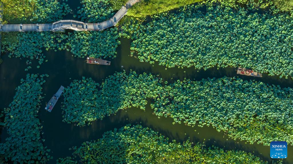 This aerial photo taken on Aug. 4, 2023 shows tourists riding a bamboo raft at Chengkan ancient village in Huangshan City, east China's Anhui Province. The ancient villages in Huangshan City witnessed a travel peak in summer. (Photo by Fan Chengzhu/Xinhua)