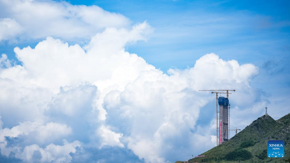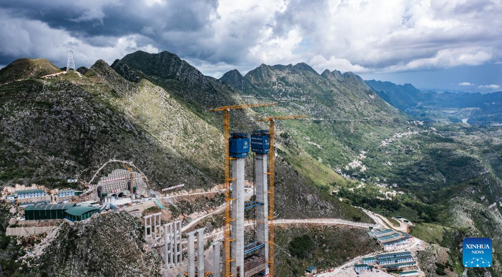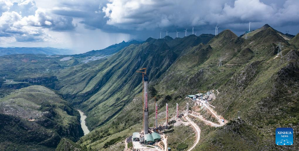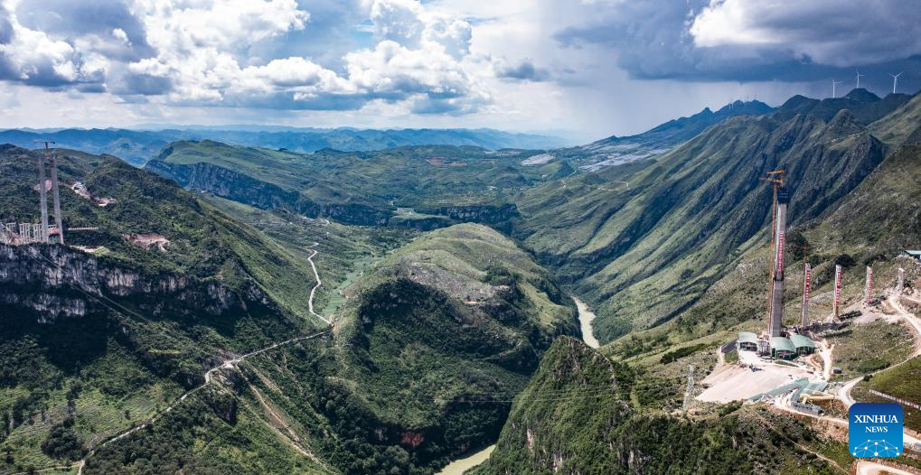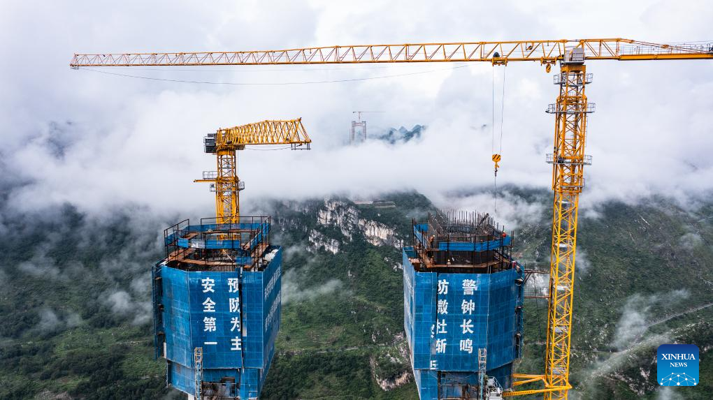 This photo taken on Aug. 3, 2023 shows the construction site of the Huajiang grand canyon bridge in southwest China's Guizhou Province. With a vertical height of 625 meters from the bridge deck down to the water's surface, the Huajiang grand canyon bridge is expected to become the highest in the world after completion in 2025. It will cut the travel time across the canyon from about an hour to a mere minute. (Xinhua/Tao Liang)