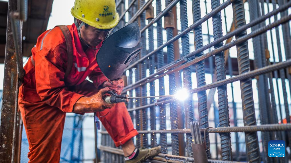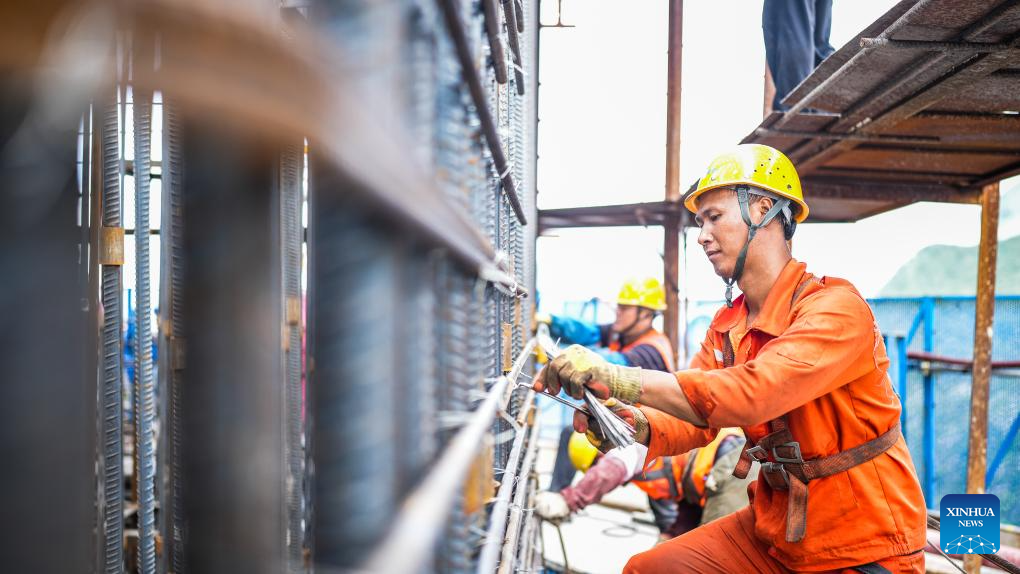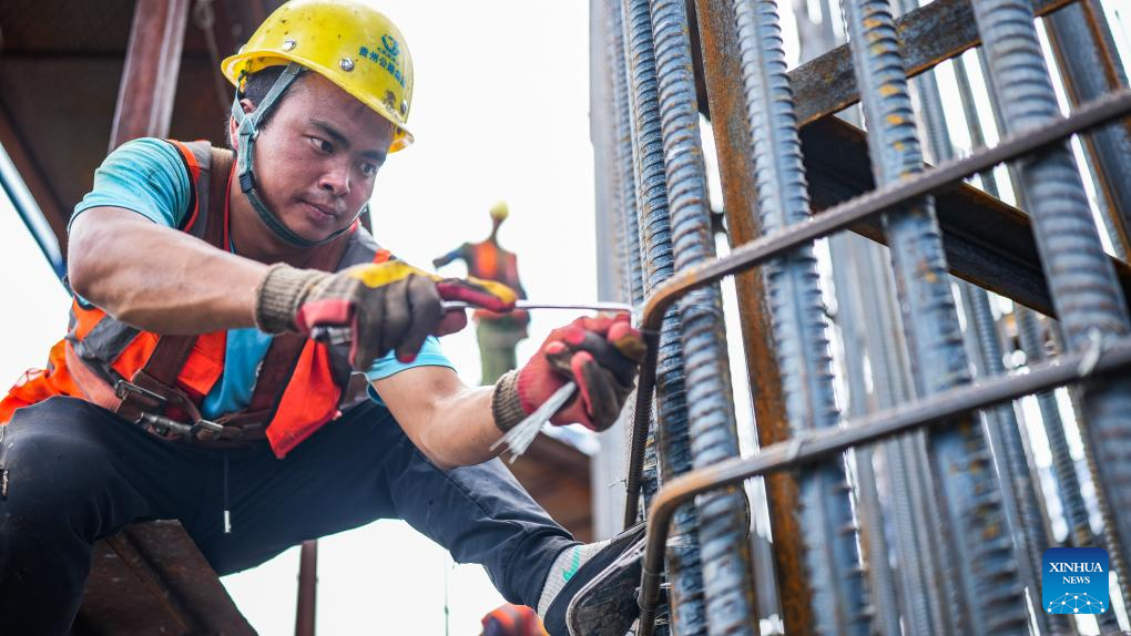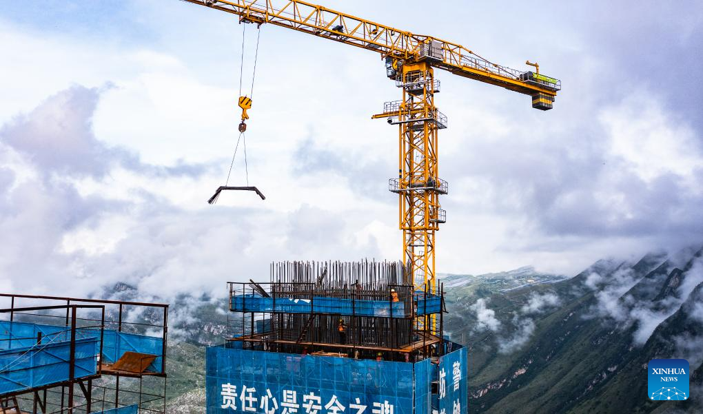 A worker works at the construction site of the Huajiang grand canyon bridge in southwest China's Guizhou Province, Aug. 3, 2023. With a vertical height of 625 meters from the bridge deck down to the water's surface, the Huajiang grand canyon bridge is expected to become the highest in the world after completion in 2025. It will cut the travel time across the canyon from about an hour to a mere minute. (Xinhua/Tao Liang)