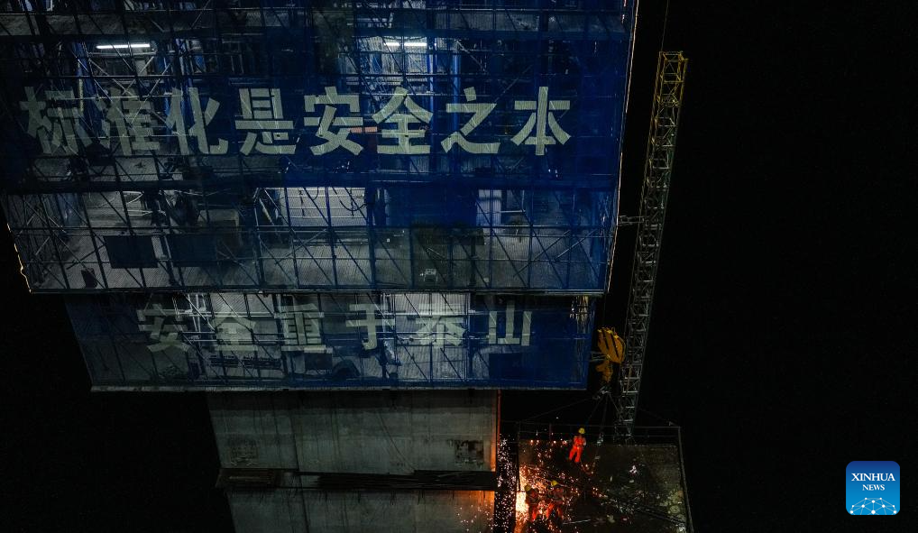Workers work at night at the construction site of the Huajiang grand canyon bridge in southwest China's Guizhou Province, Aug. 2, 2023. With a vertical height of 625 meters from the bridge deck down to the water's surface, the Huajiang grand canyon bridge is expected to become the highest in the world after completion in 2025. It will cut the travel time across the canyon from about an hour to a mere minute. (Xinhua/Tao Liang)