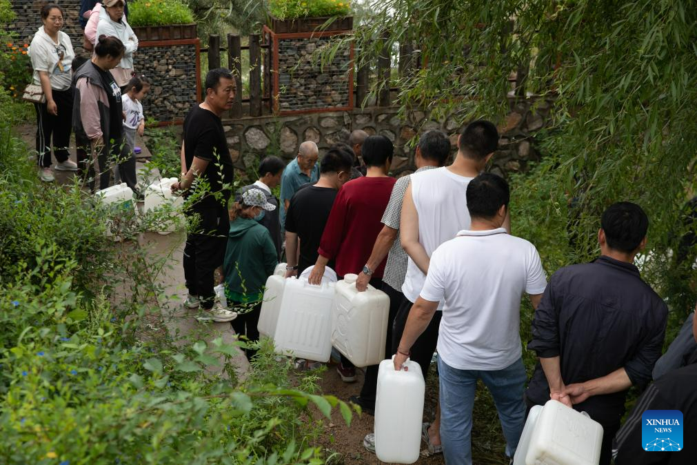 People fetch fresh water at a dispensing site in Changting Township, Hailin City in northeast China's Heilongjiang Province, Aug. 6, 2023. Tap water and power supply has been interrupted in parts of Changting Township due to recent flooding, which also damaged some of the residences there. Residents and rescuers are working all out to put life back to normal. (Xinhua/Zhang Tao)
