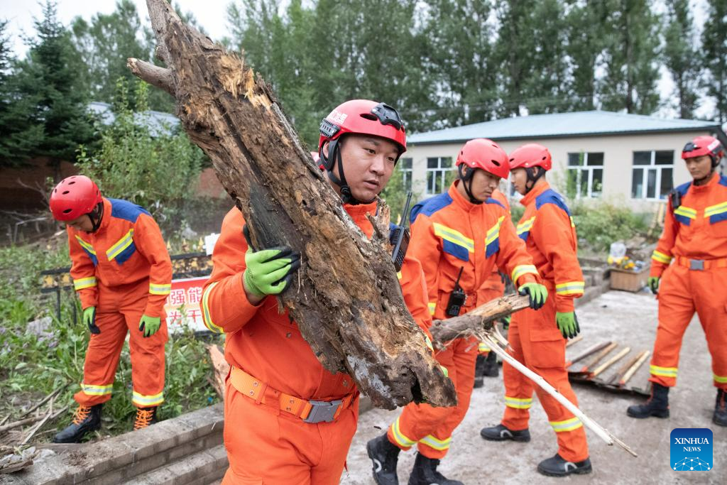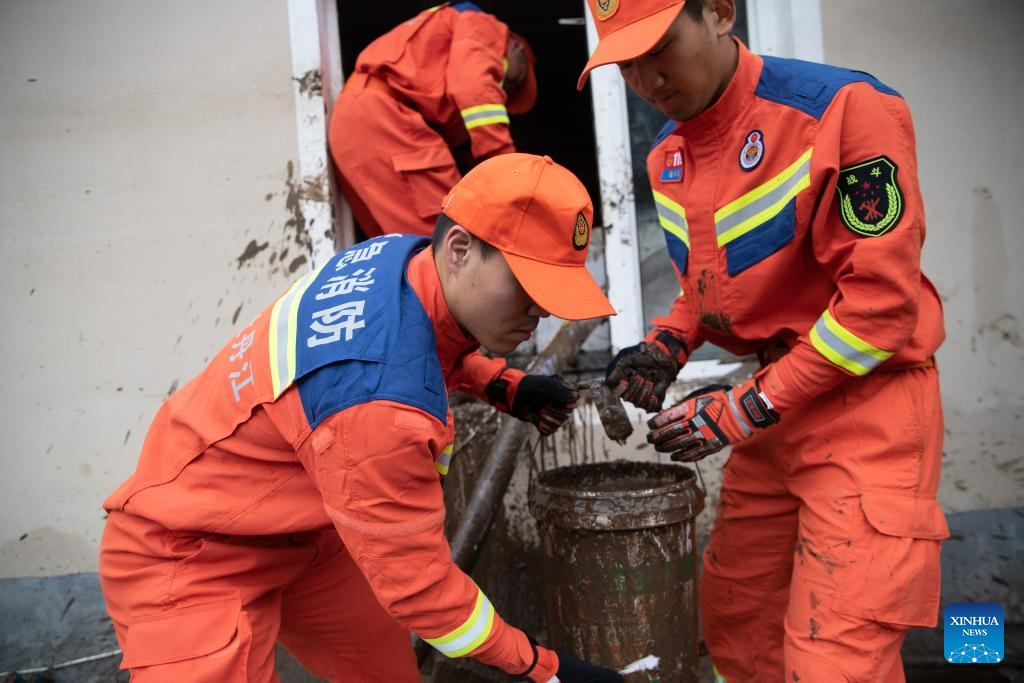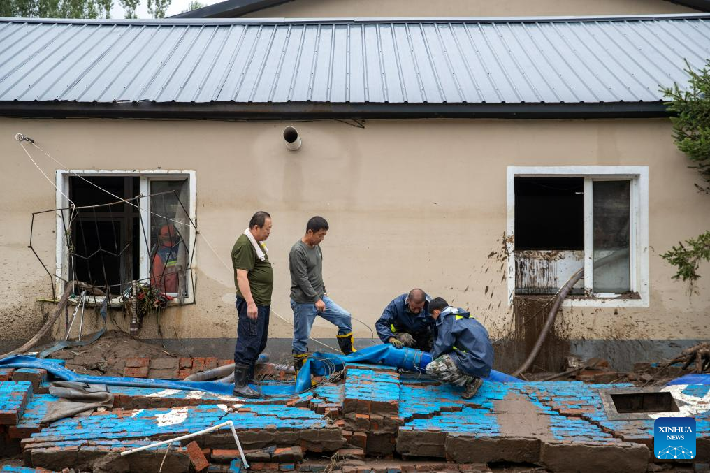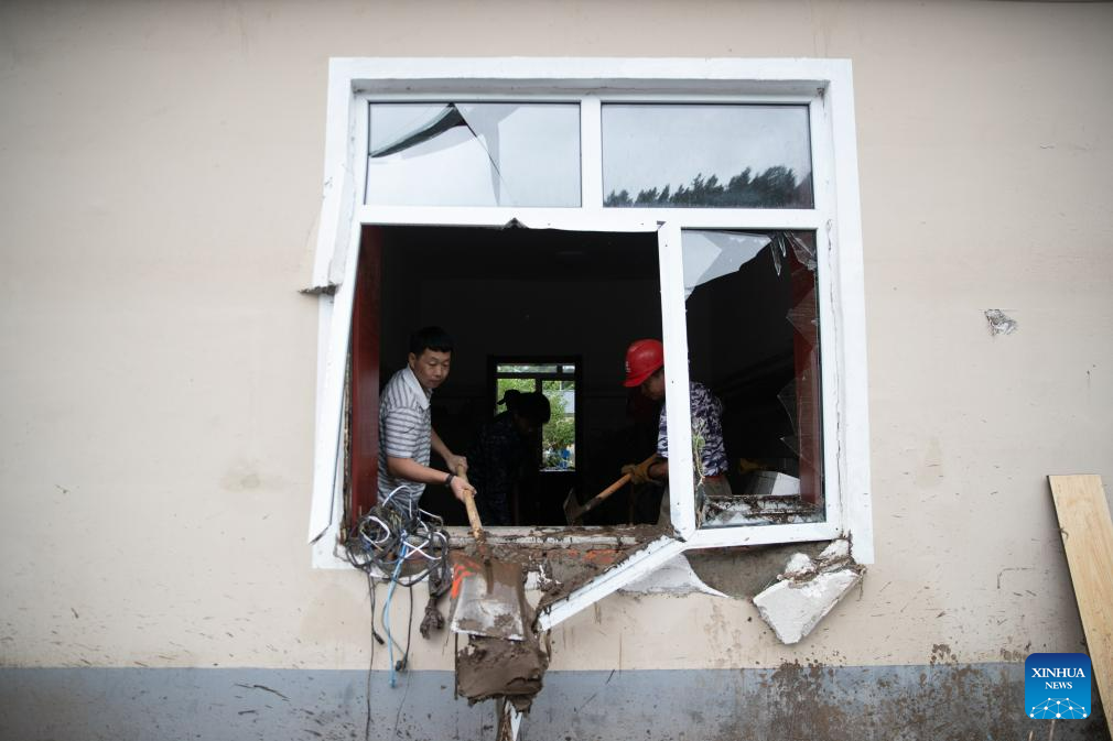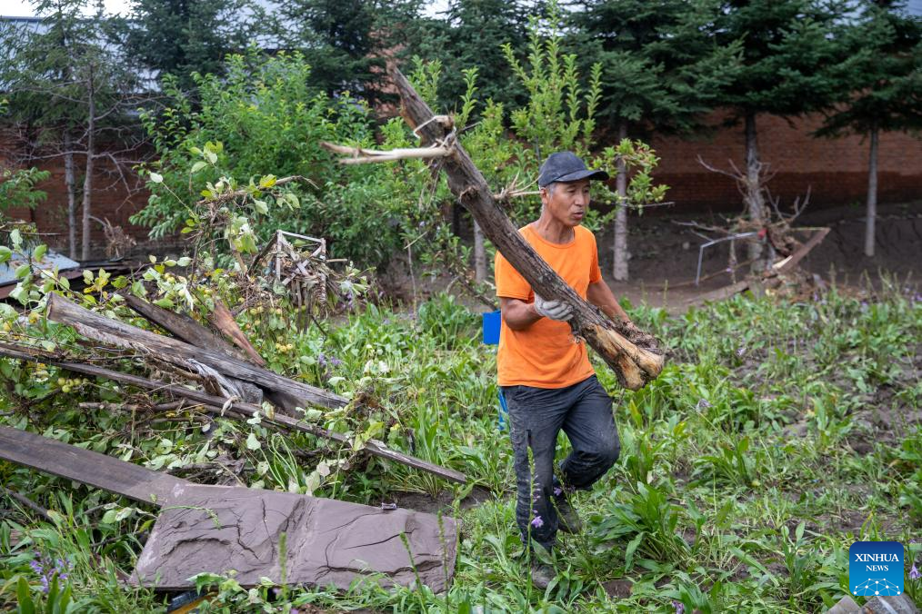 Rescuers clean up a yard in Changting Township, Hailin City in northeast China's Heilongjiang Province, Aug. 6, 2023. Tap water and power supply has been interrupted in parts of Changting Township due to recent flooding, which also damaged some of the residences there. Residents and rescuers are working all out to put life back to normal. (Xinhua/Zhang Tao)
