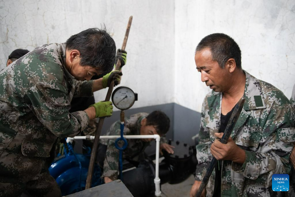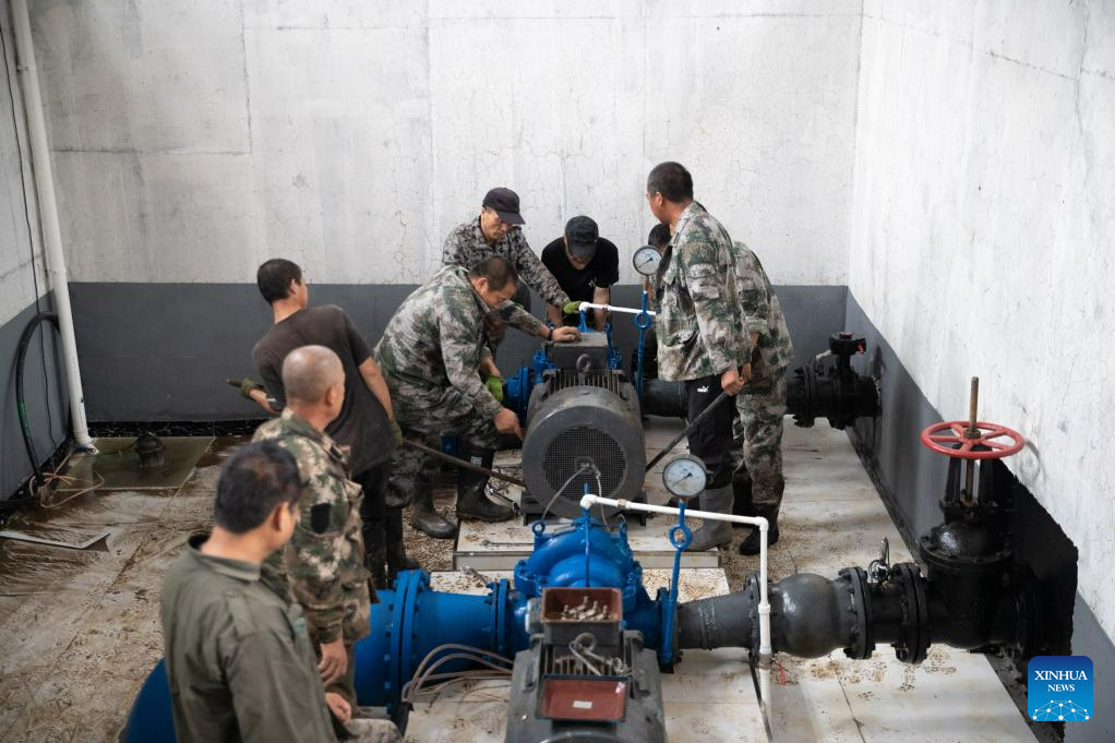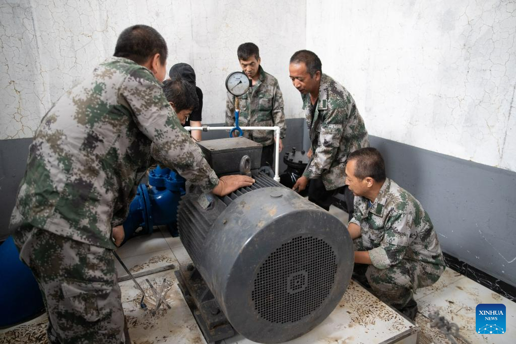 Staff members repair a pump at a tap water station in Changting Township, Hailin City in northeast China's Heilongjiang Province, Aug. 6, 2023. Tap water and power supply has been interrupted in parts of Changting Township due to recent flooding, which also damaged some of the residences there. Residents and rescuers are working all out to put life back to normal. (Xinhua/Zhang Tao)
